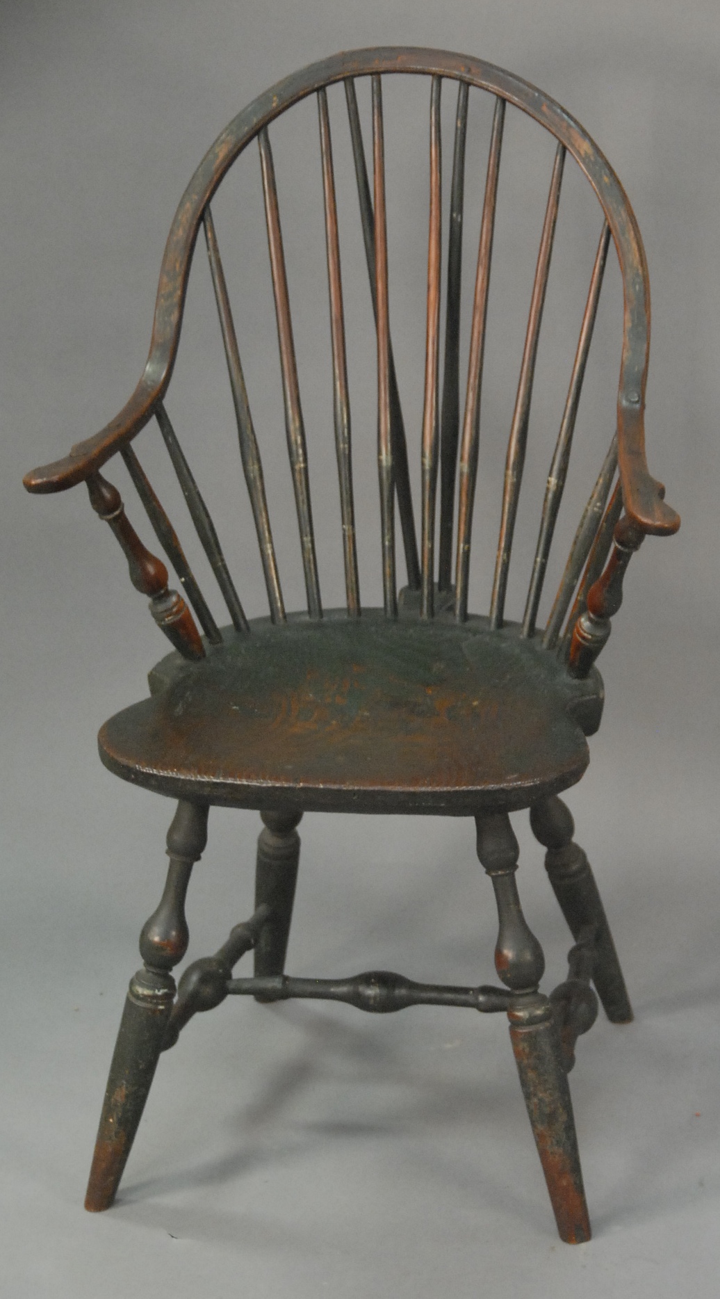 E. B. Tracy continuous arm Windsor chair with brace back having bold turned arm supports, legs, and stretchers, in old green paint, signed on bottom E. B. Tracy. seat ht. 17 1/2 in. Provenance: Property from the Estate of Elizabeth and Edward Wallace of The Tracy House in Meriden, Connecticut.
