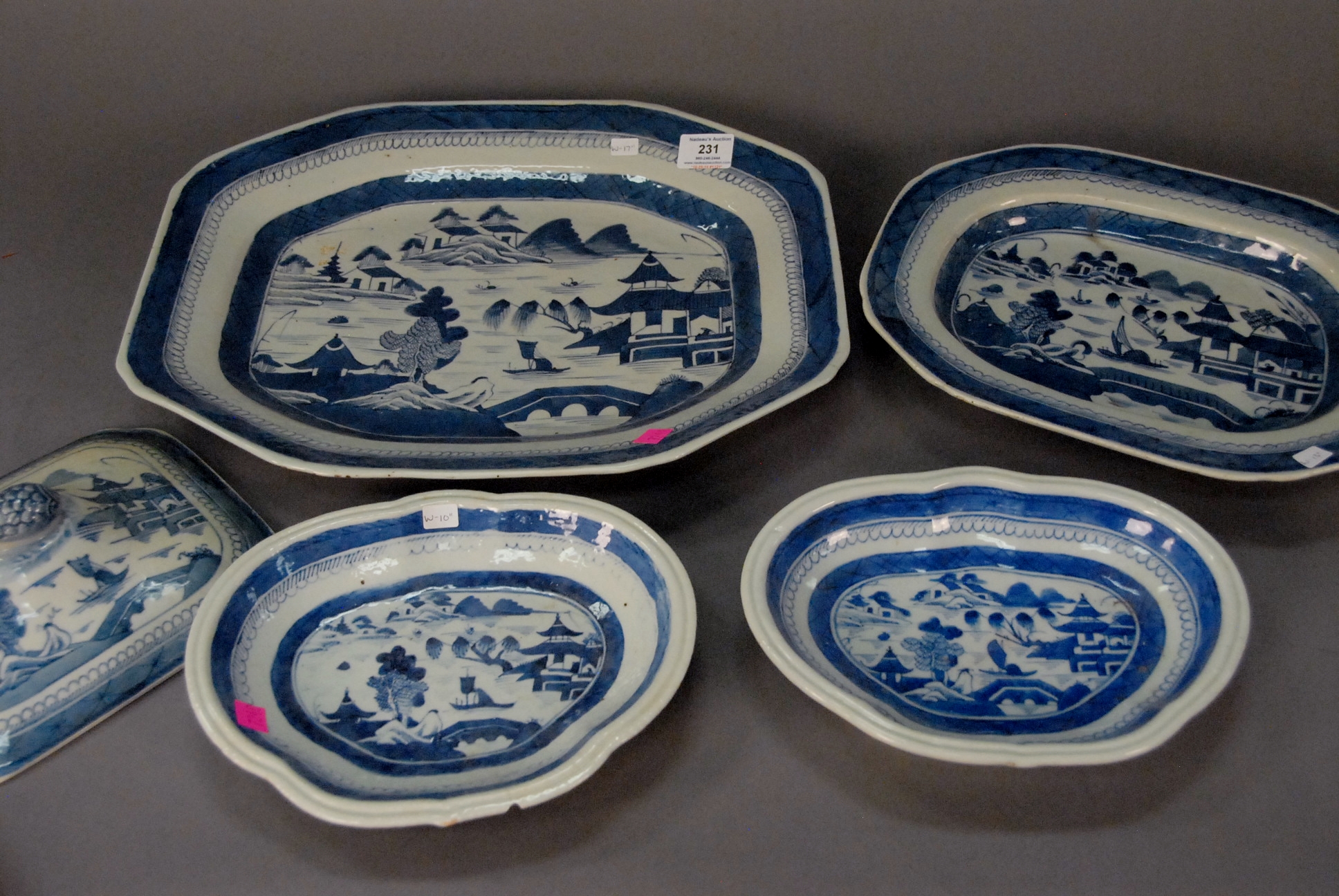 Five piece Canton lot to include two platters, two shaped dishes, and one cover. large platter: 14 x 17 Provenance: Property from The Estate of Margaret Oliphant of Old Lyme, Connecticut