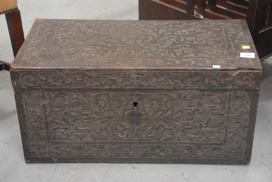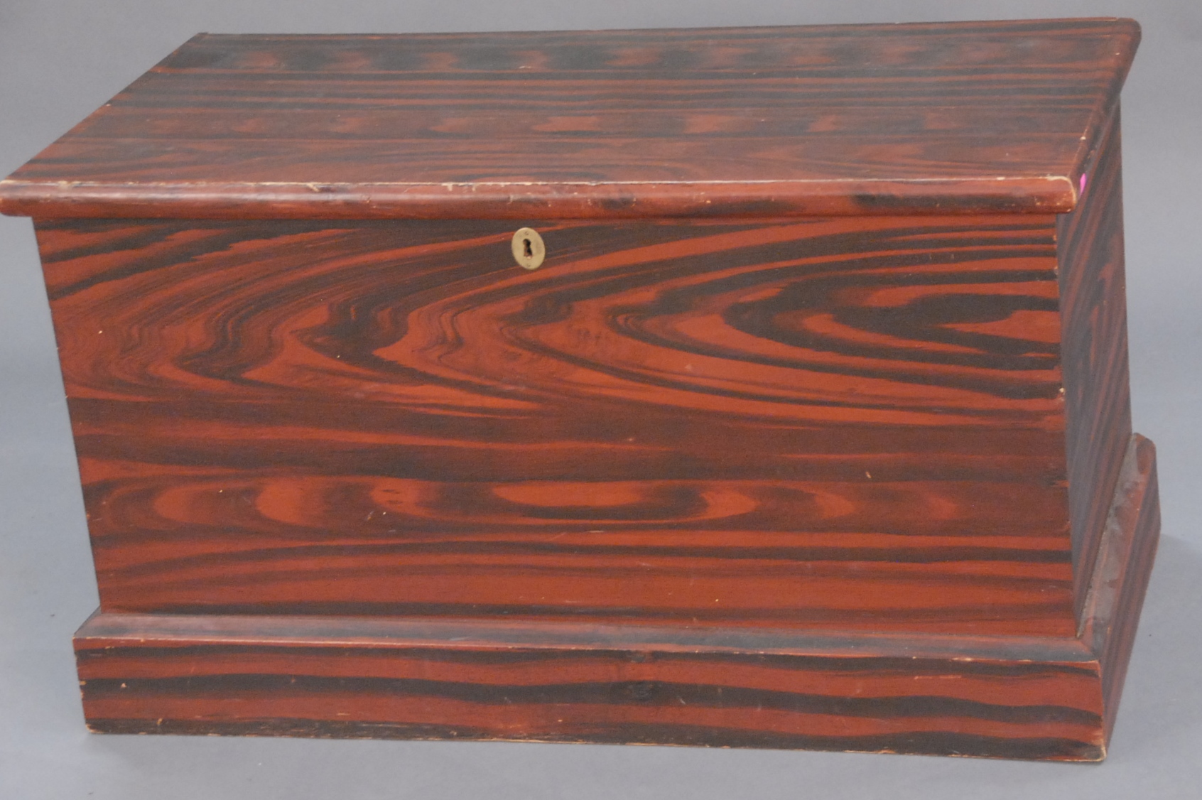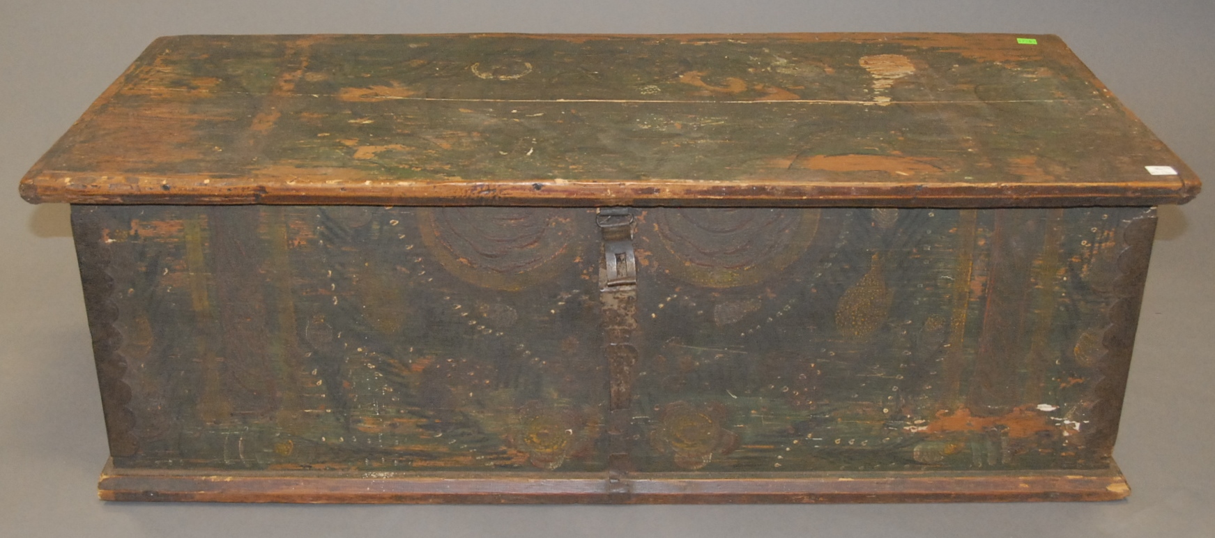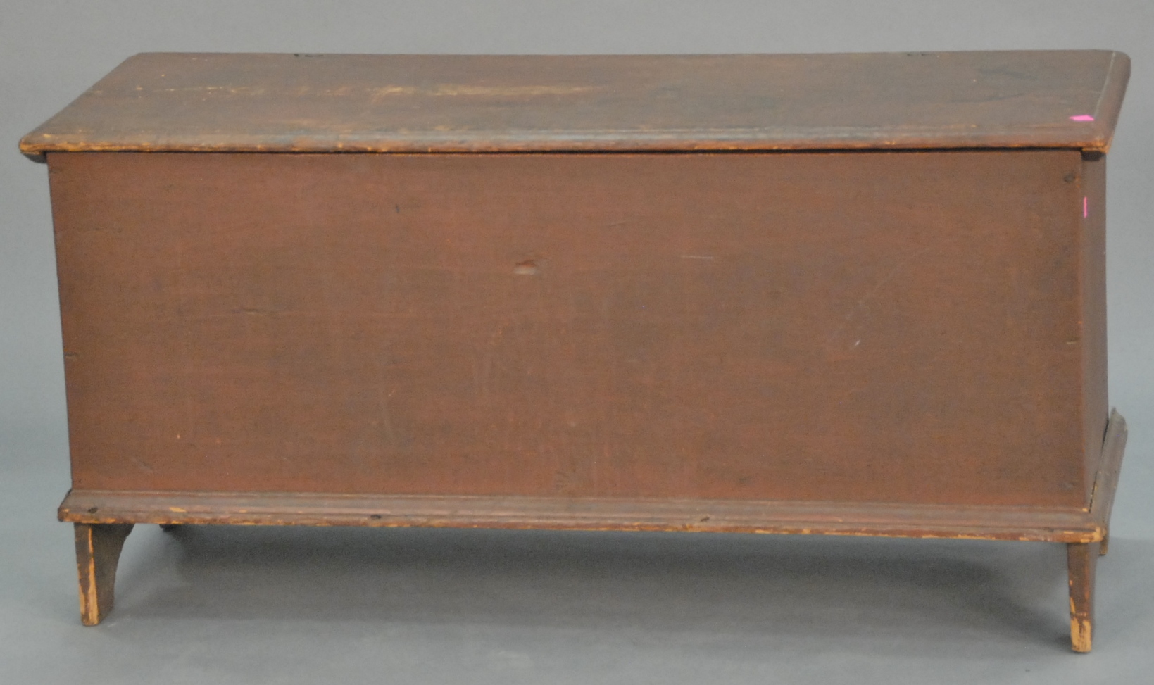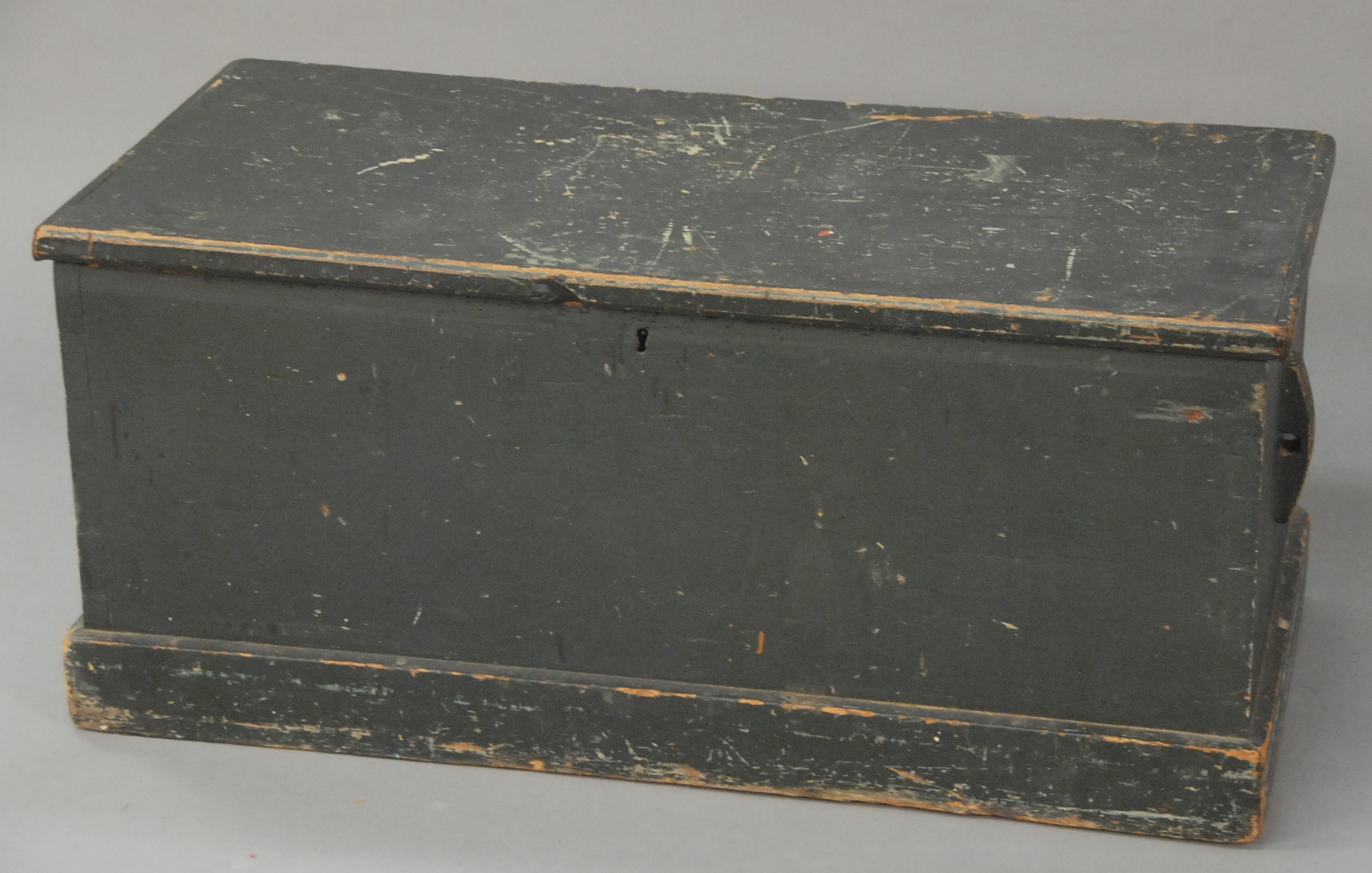 Primitive dovetailed lift top chest in old green paint on plain molded base. ht. 17 1/2 in. wd. 37 1/2 in. Provenance: Property from the Estate of Elizabeth and Edward Wallace of The Tracy House in Meriden, Connecticut.