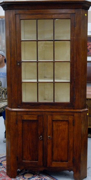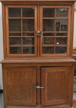 Primitive pine cupboard having two glazed doors with six glass panels in each over base with two blind doors on plain base, all with framed borders. ht. 85 in. wd. 55 1/2 in. dp. 23 1/2 in.