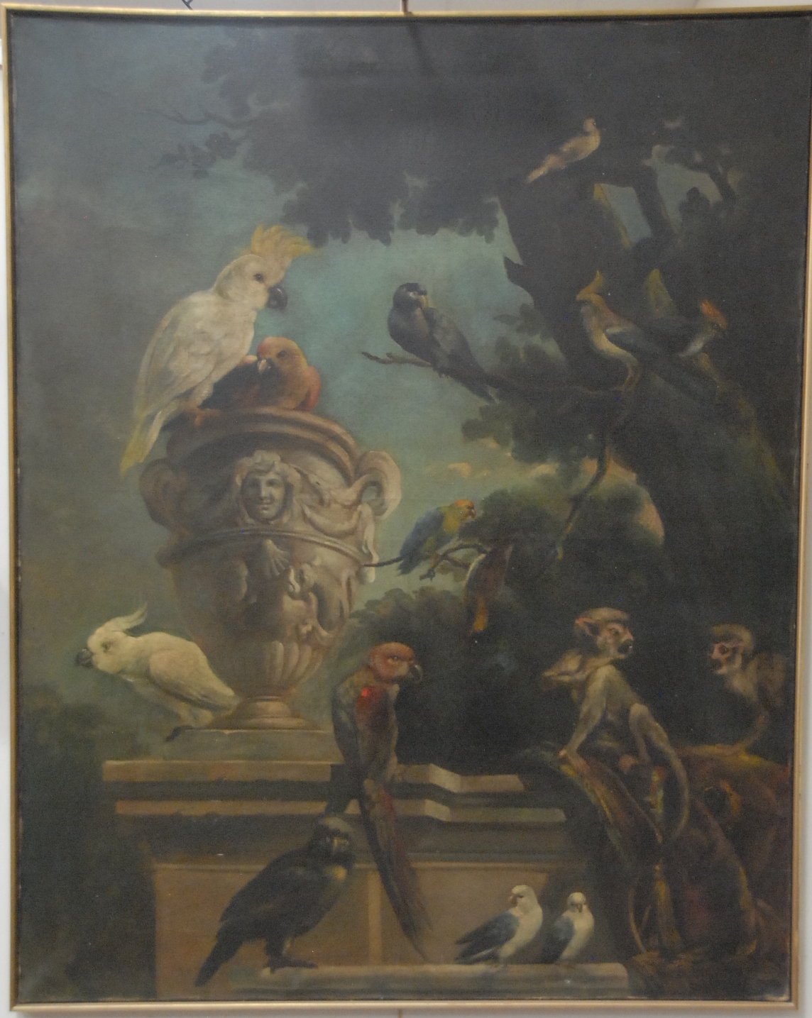 Still Life MONKEYS AND BIRDS AMONGST LARGE VICTORIAN URN oil on canvas unsigned 60 x 48 Provenance: Property from The Estate of Margaret Oliphant of Old Lyme, Connecticut