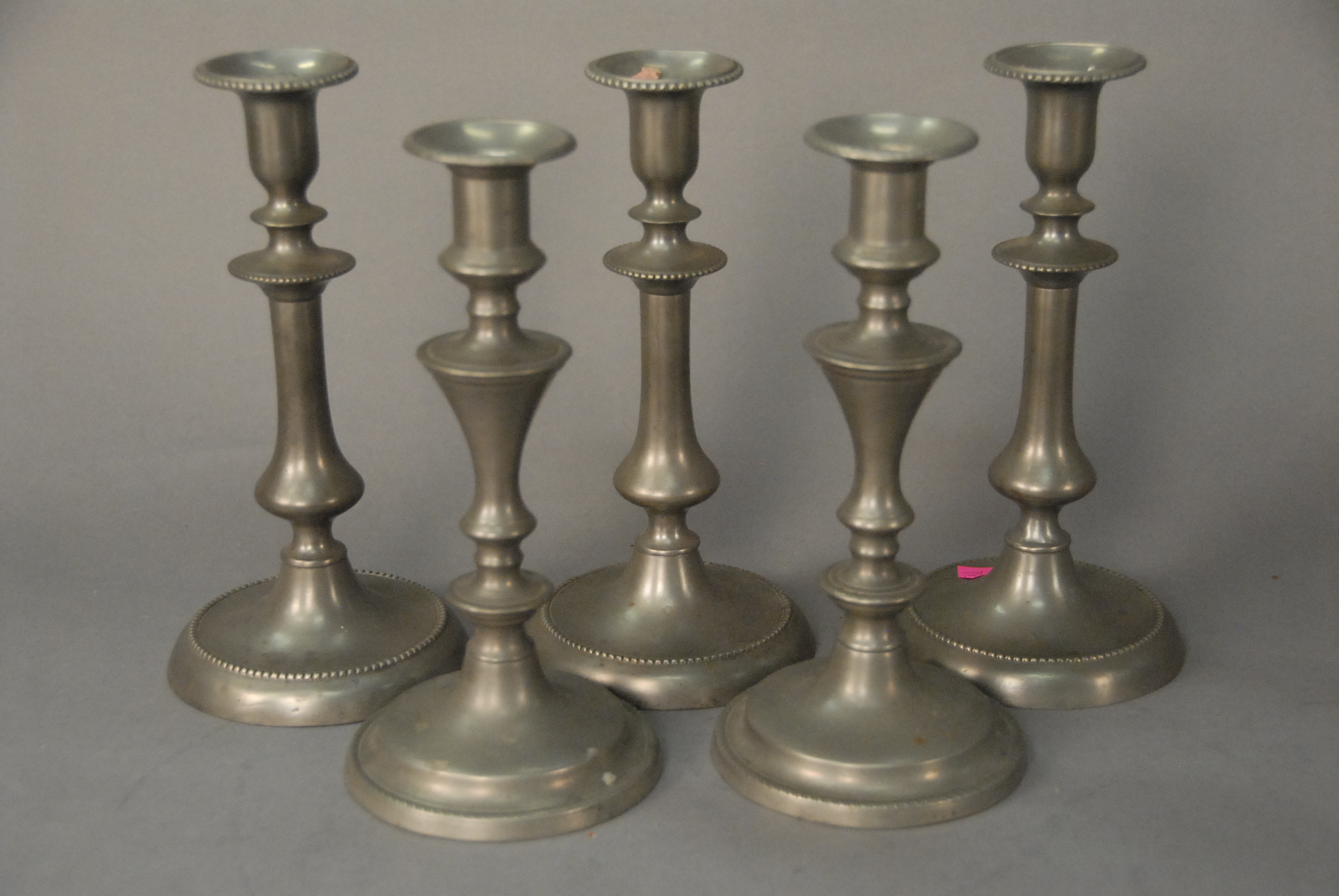 Five piece lot to include set of three pewter push-up candlesticks and pair of push-up candlesticks. ht. 7 1/2 in. Provenance: Property from the Estate of Elizabeth and Edward Wallace of The Tracy House in Meriden, Connecticut.