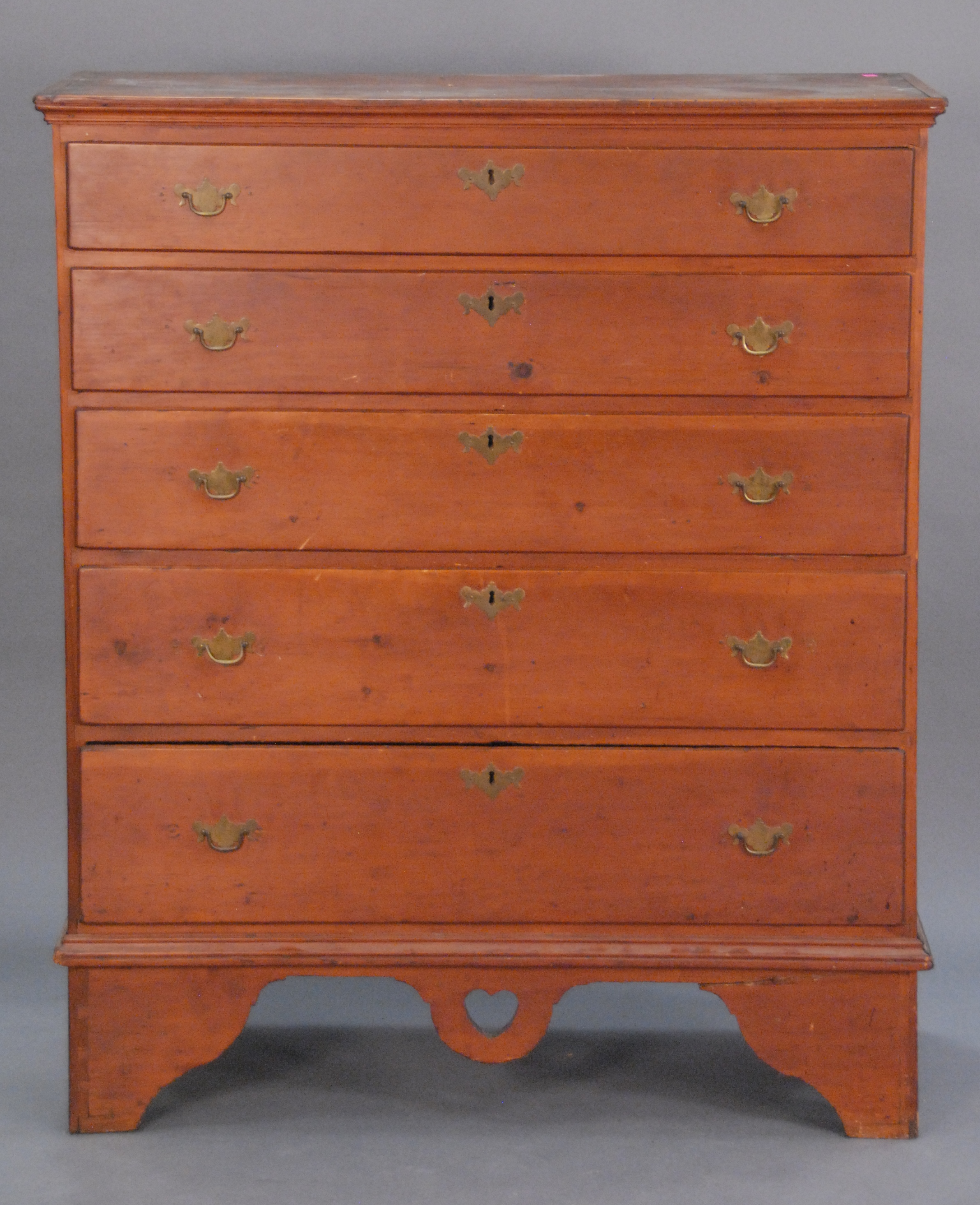 Chippendale tall chest having cornice molded top over five graduated drawers on dovetailed bracket base with center drop having cut out heart, old finish, and original hardware. ht. 52 in. wd. 42 in. dp. 17 in.