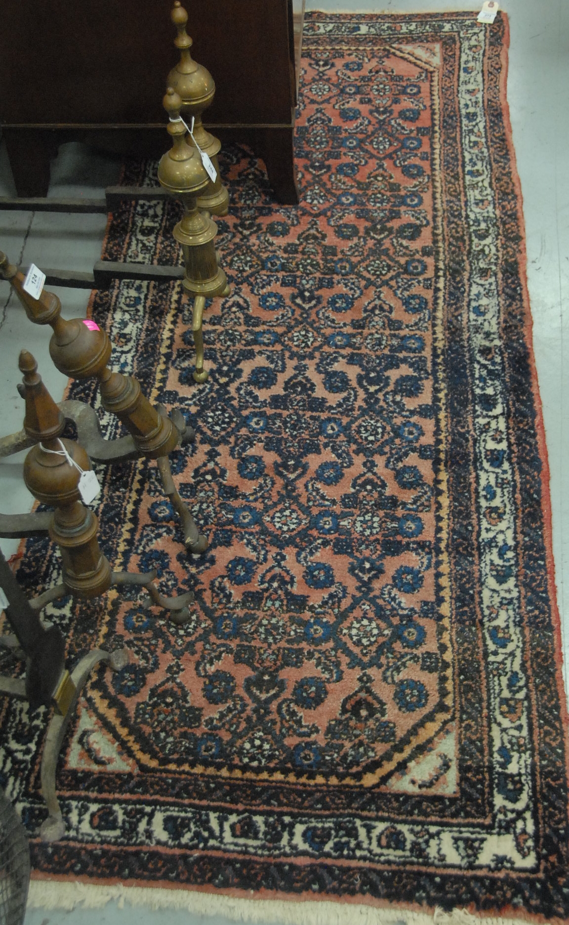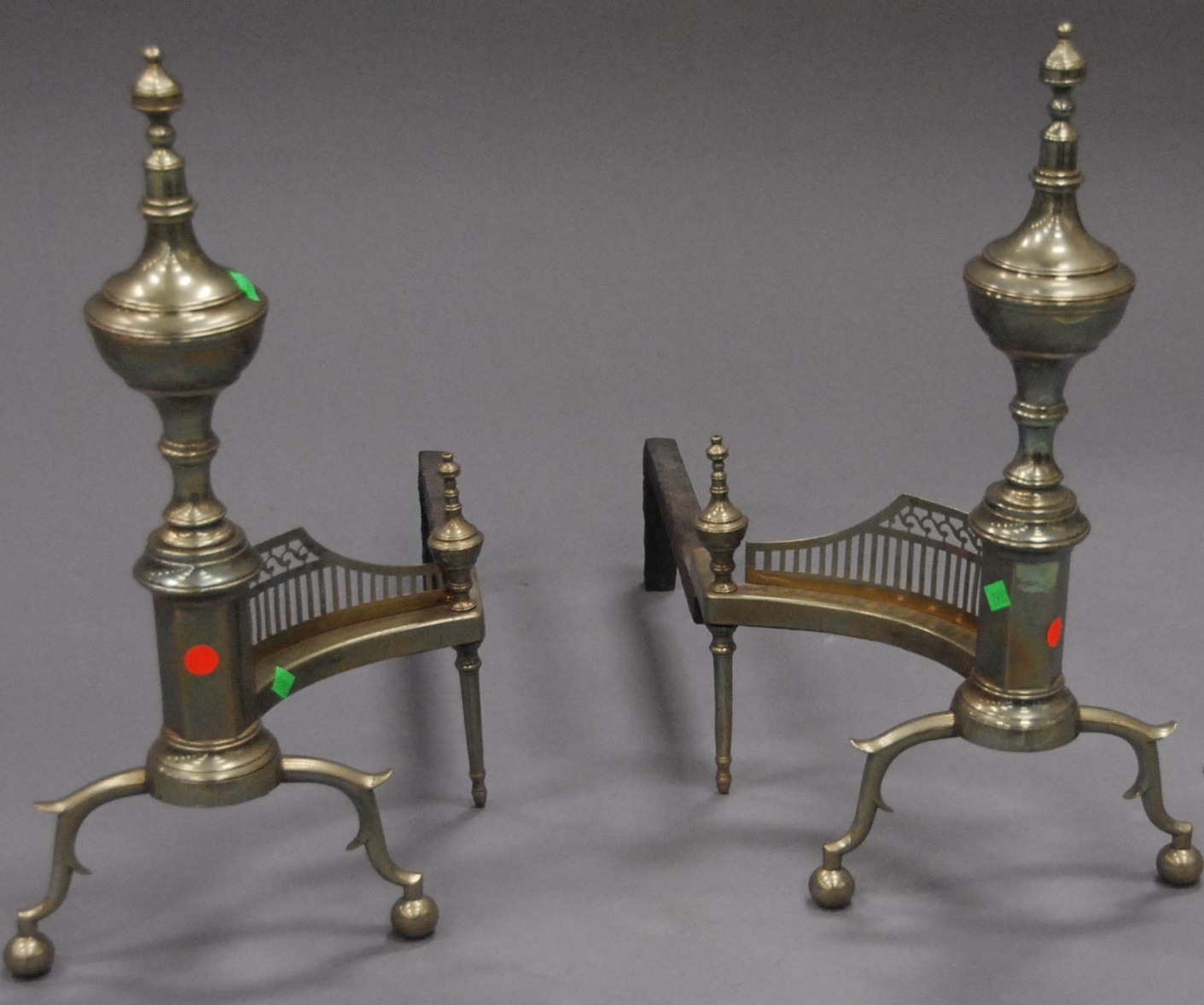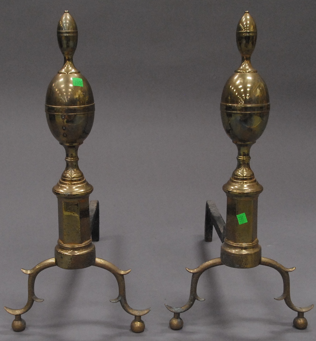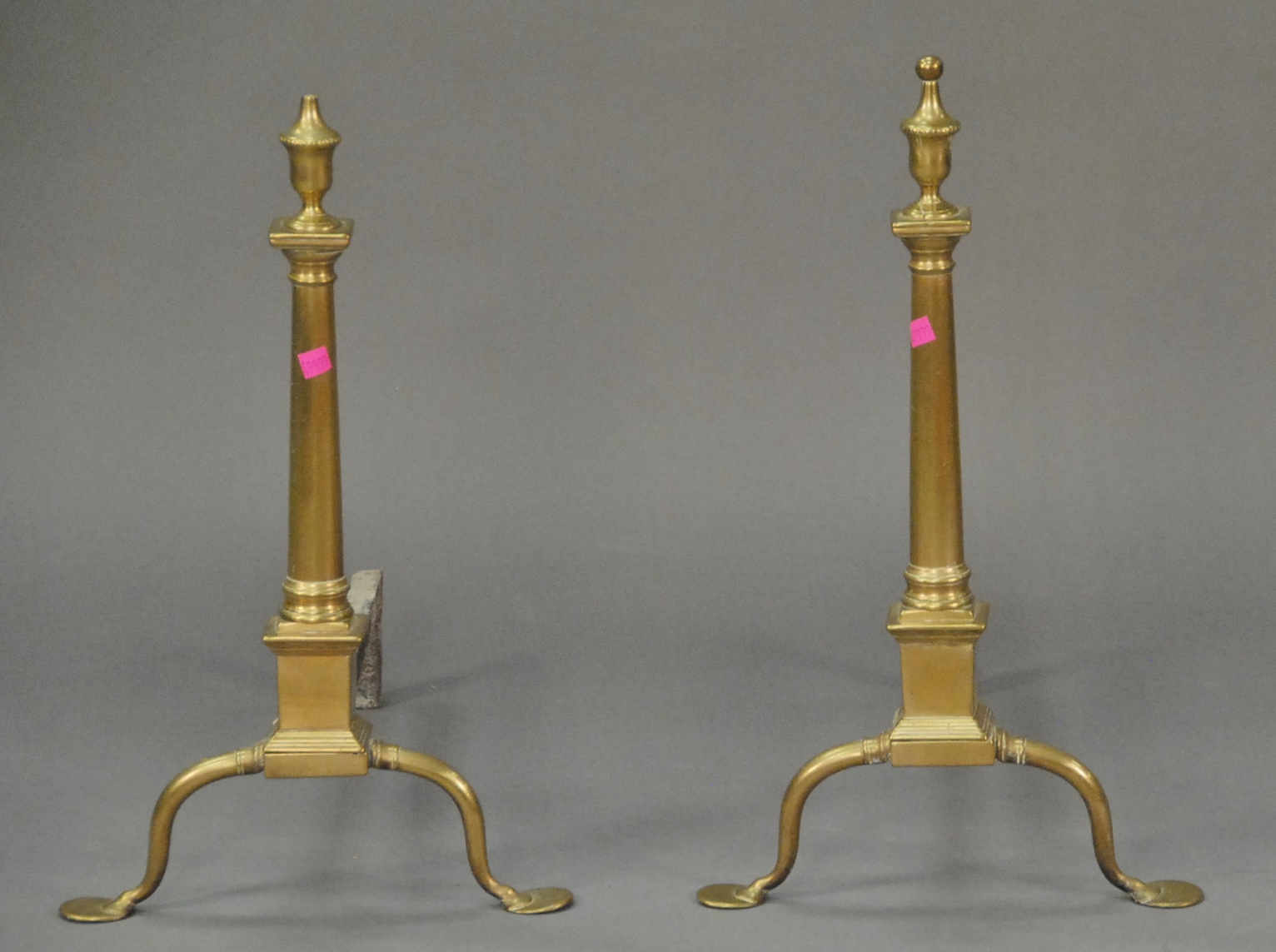 Pair of Federal brass andirons having turned finials over urns on spurred legs and ball feet, each with pierced brass and log stops. ht. 23 1/2 in. Provenance: Property from a Private Collection Sold for the Benefit of the Virginia Historical Society.