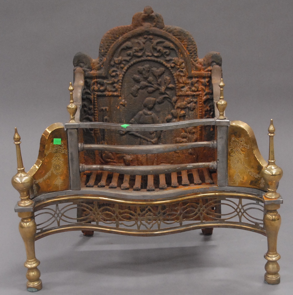 Federal style log holder with iron fire back and brass finials and trim. ht. 30 in. wd. 28 in. Provenance: Property from a Private Collection Sold for the Benefit of the Virginia Historical Society.