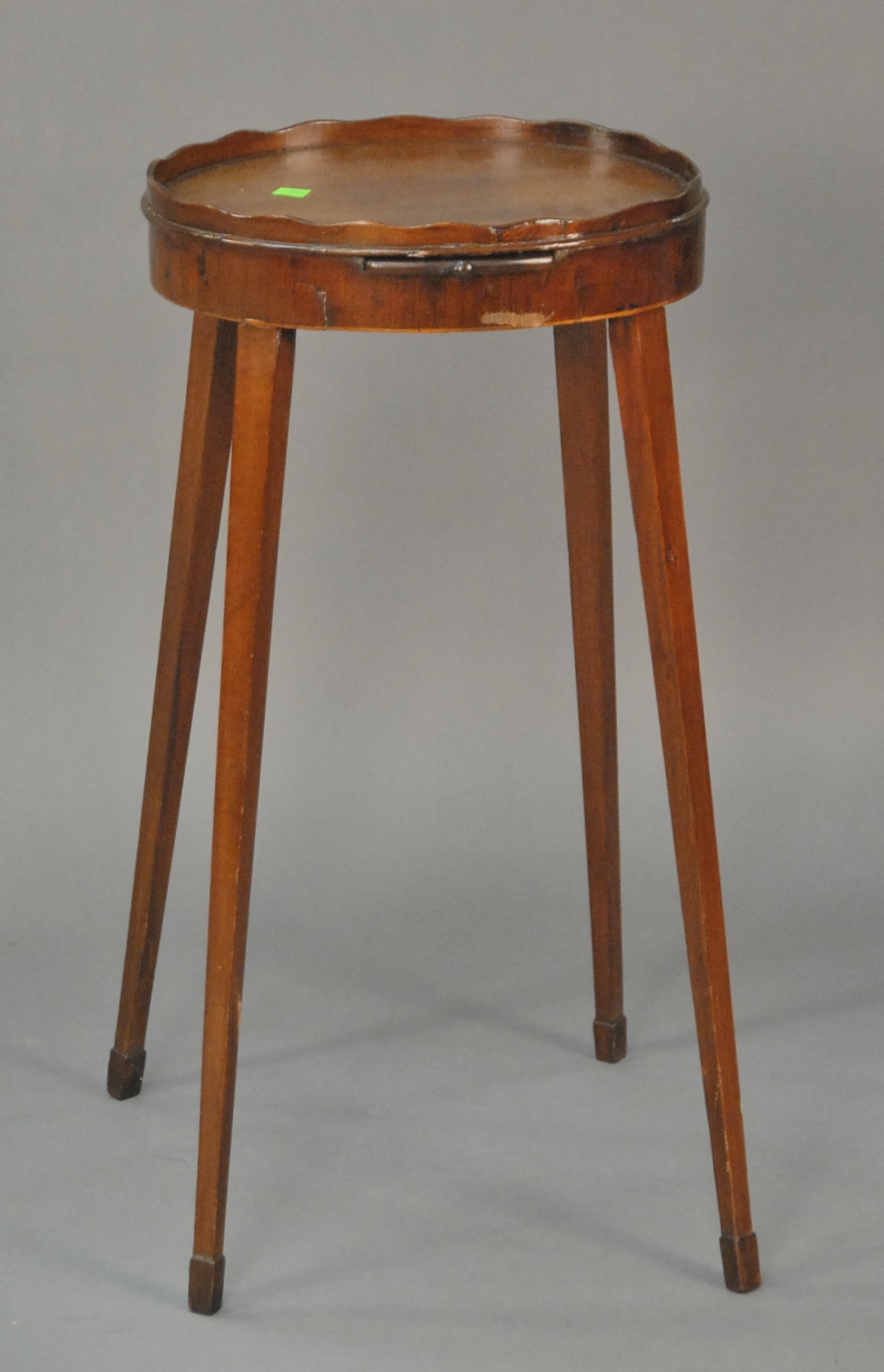 George IV mahogany stand with oval top having scalloped edge and pull out candle slide, on square tapered splayed legs ending in spade feet. ht. 27 in. wd. 13 1/2 in. dp. 10 1/2 in. Provenance: Property from a Private Collection Sold for the Benefit of the Virginia Historical Society.
