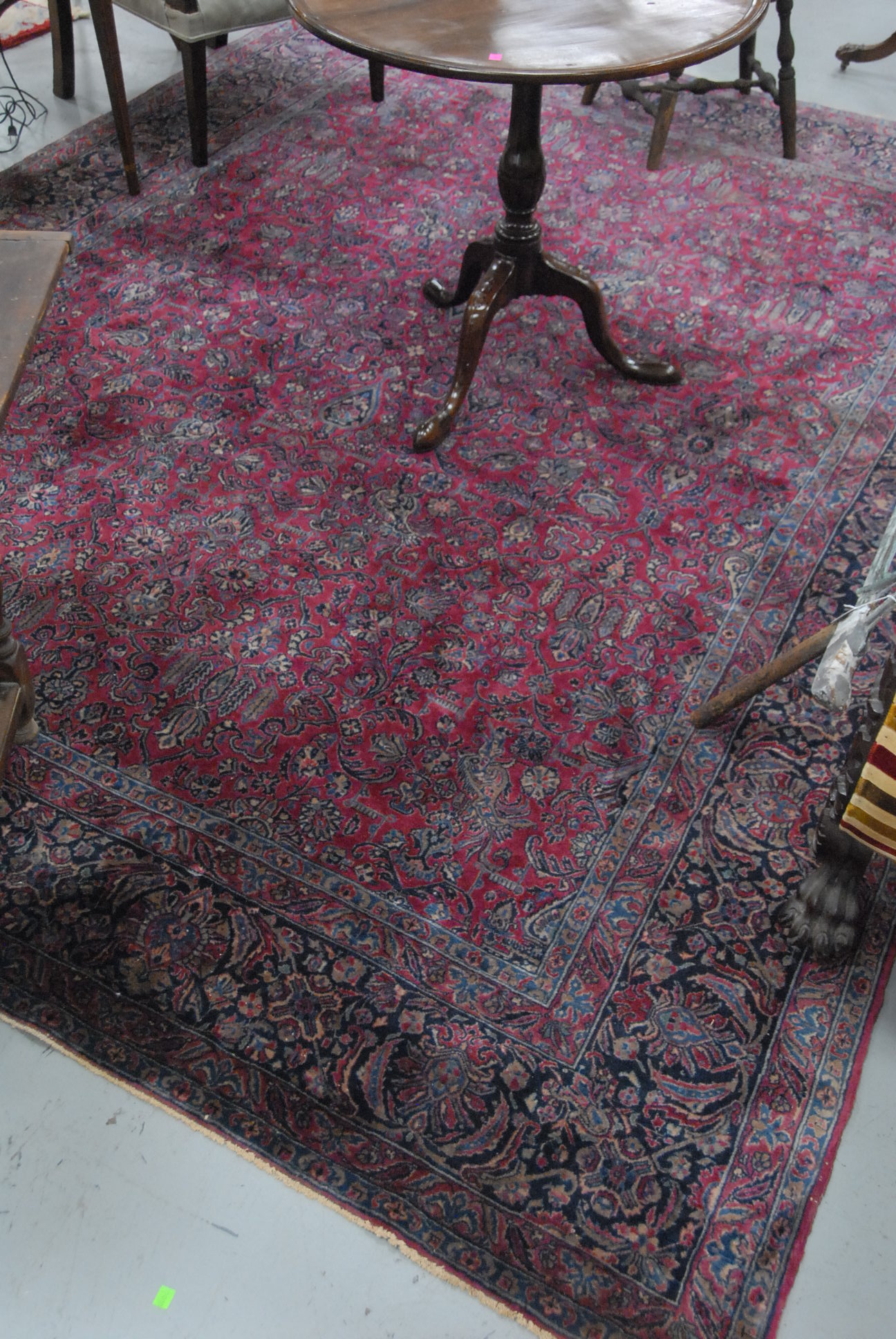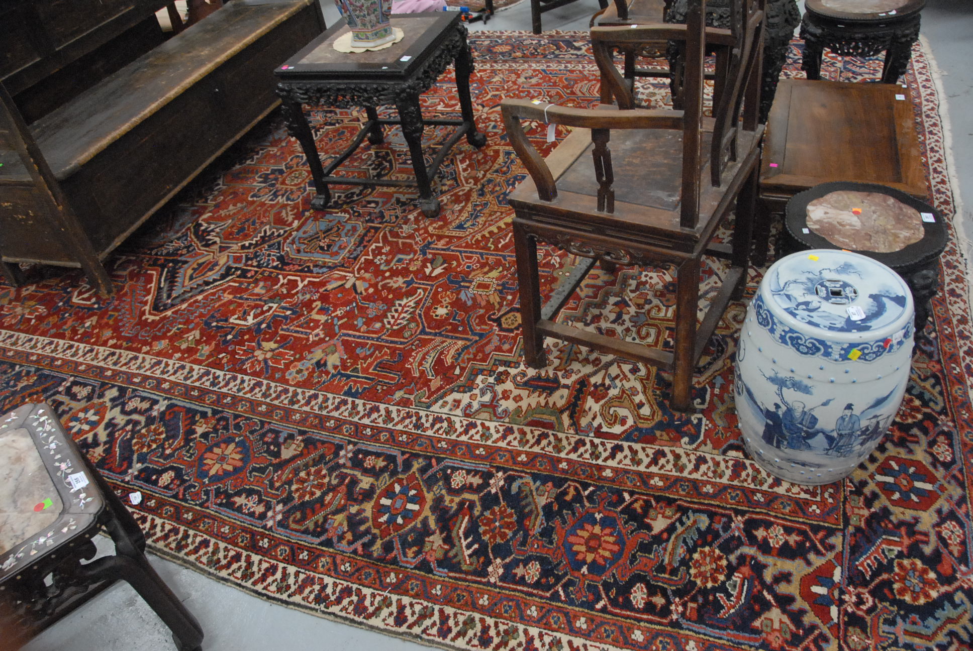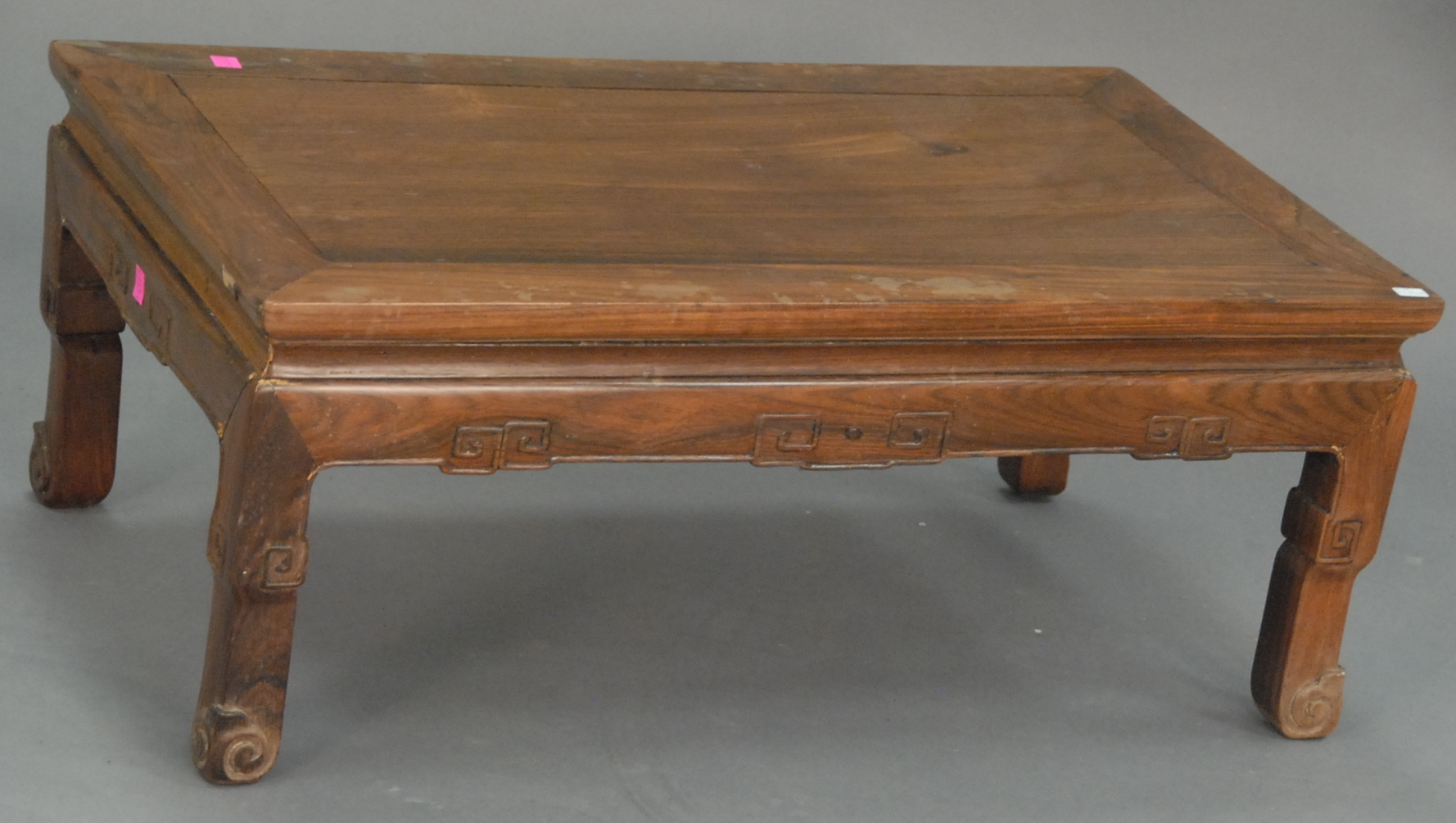 Large square hardwood taboret with russet marble top, carved openwork apron depicting prunus, shoulders with masks, ball and claw feet with open stretcher, China, 19th/20th century marble as is. ht. 22in. top: 23 x 23