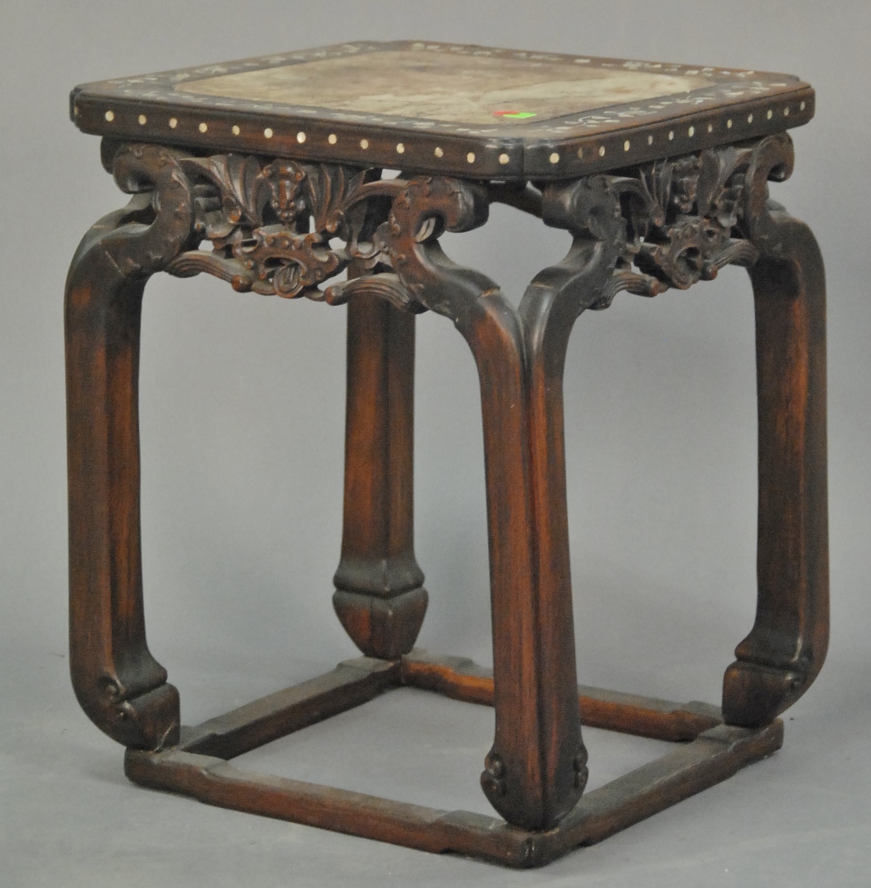 Square hardwood taboret with mother of pearl and wire inlay and russet marble top, nicely carved openwork apron depicting a stylized bat, splayed shouldered legs ending in hoof foot atop stretcher, China 19th/20th century. ht. 20in. top measures 16 x 16