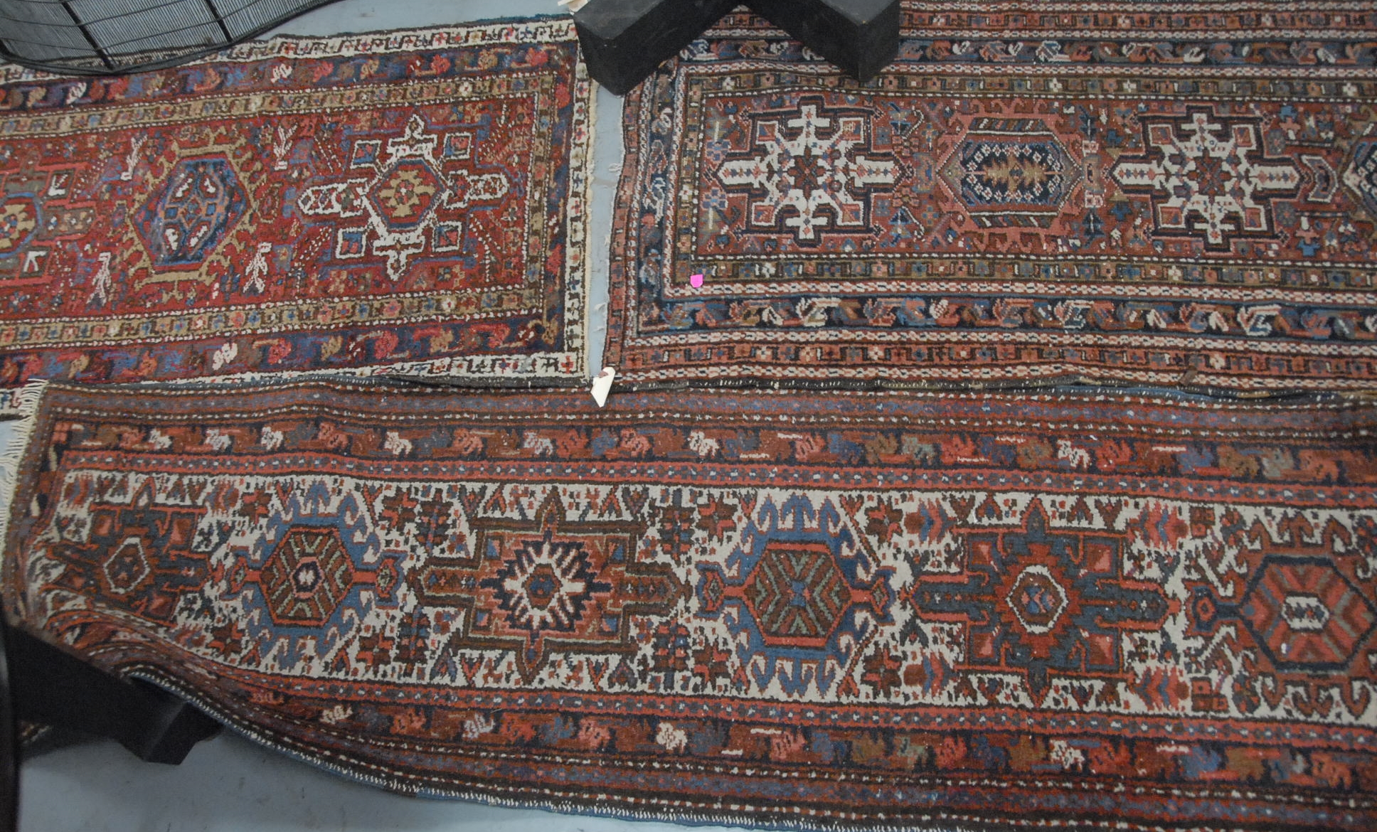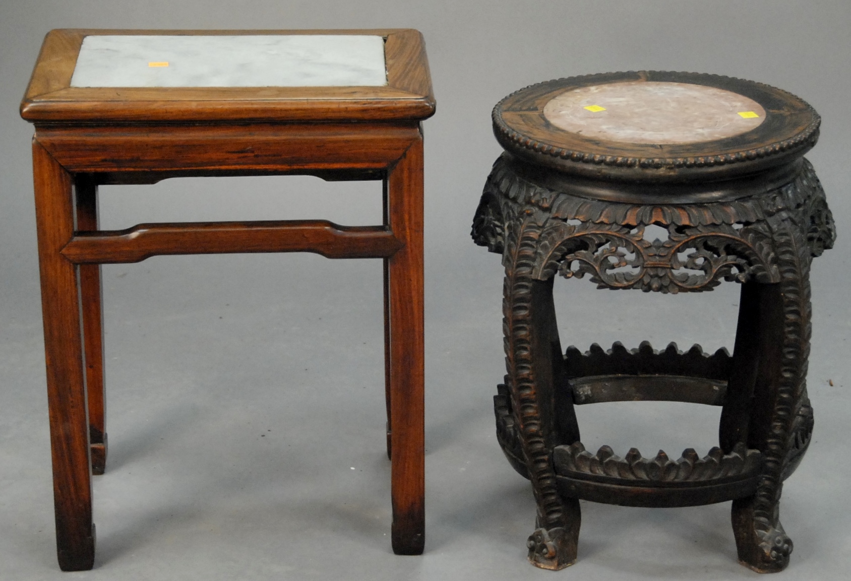 Two hardwood taborets, both with russet marble inlaid tops and heavily carved openwork aprons with ball-and-claw legs, China, 19th century lobed top lose. ht. 16in. and 18in.
