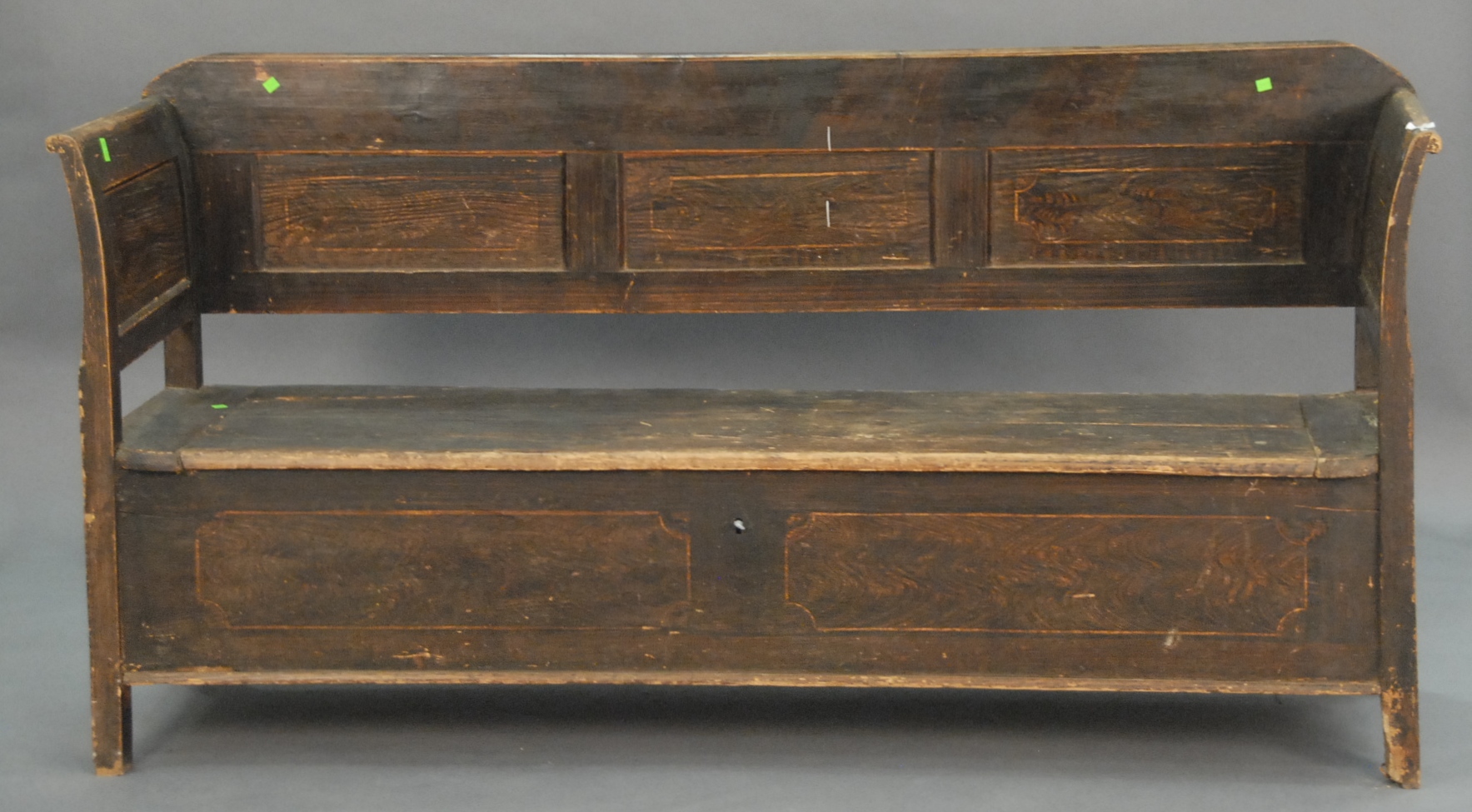 Primitive floor chest with lift top having original green grain painted top, front painted with columns and flowers, corners decorated with tin hinges replaced. ht. 13 in. wd. 40 in.
