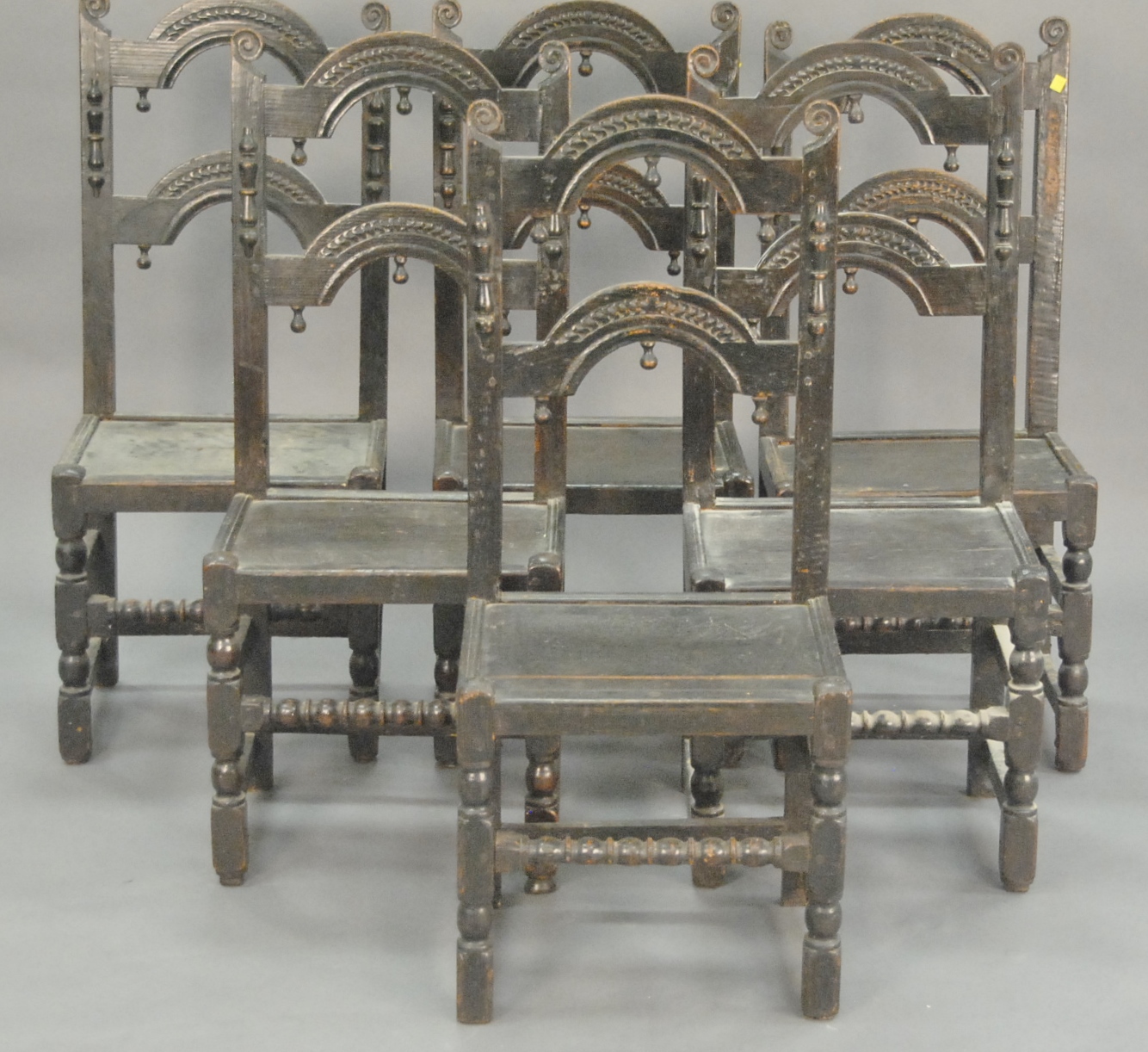 Set of six English Yorkshire side chairs, carved oak on block and turned legs, 17th century. Provenance: Property from The Estate of Margaret Oliphant of Old Lyme, Connecticut