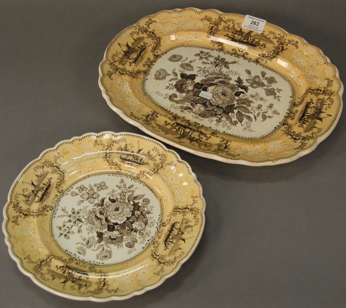 Staffordshire eighteen piece set including sixteen plates and two platters, brown, white, and yellow Shiraz, Shiraz Jr. platters: lg. 15 in. plates: dia. 10 1/2 in.