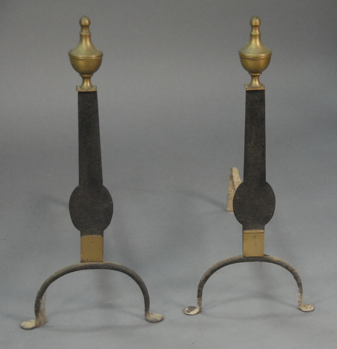 Pair of Federal iron knife blade andirons with brass finials. ht. 21 in. Provenance: Property from the Estate of Elizabeth and Edward Wallace of The Tracy House in Meriden, Connecticut.