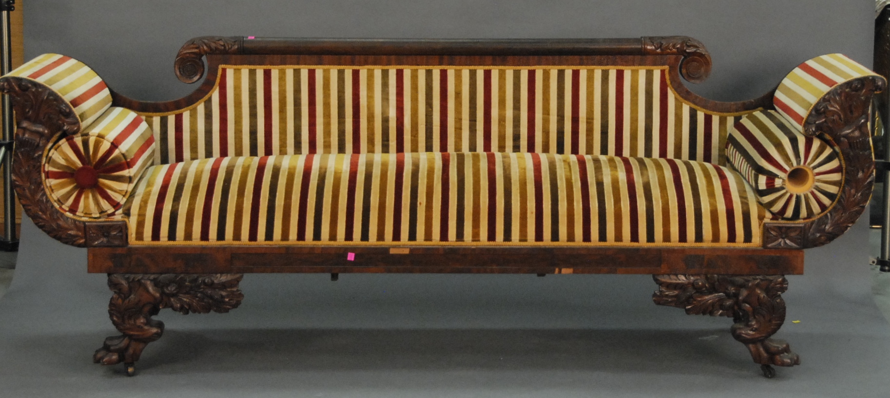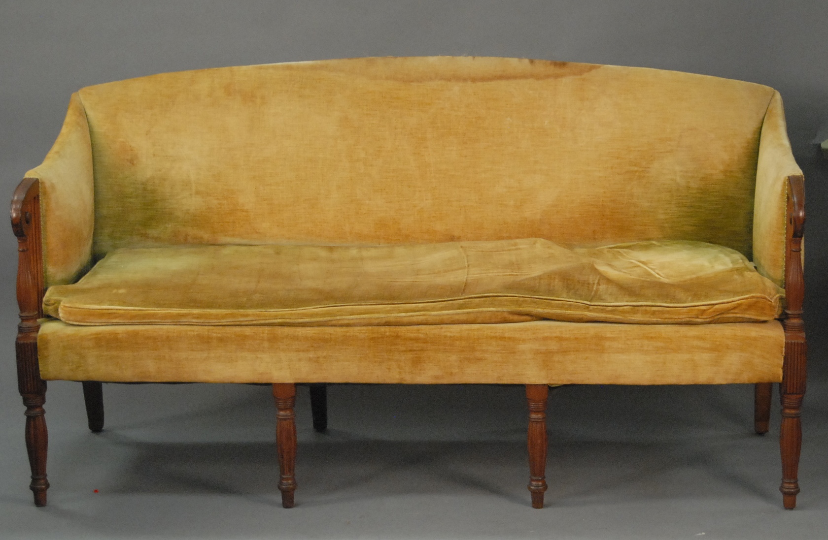 Sheraton mahogany small sofa having mahogany scrolled hand rests over fluted supports all set on four front turned and fluted legs, circa 1830-1840. seat ht. 16 in. total ht. 35 1/2 in. lg. 66 in. Provenance: Property from the Estate of Elizabeth and Edward Wallace of The Tracy House in Meriden, Connecticut.