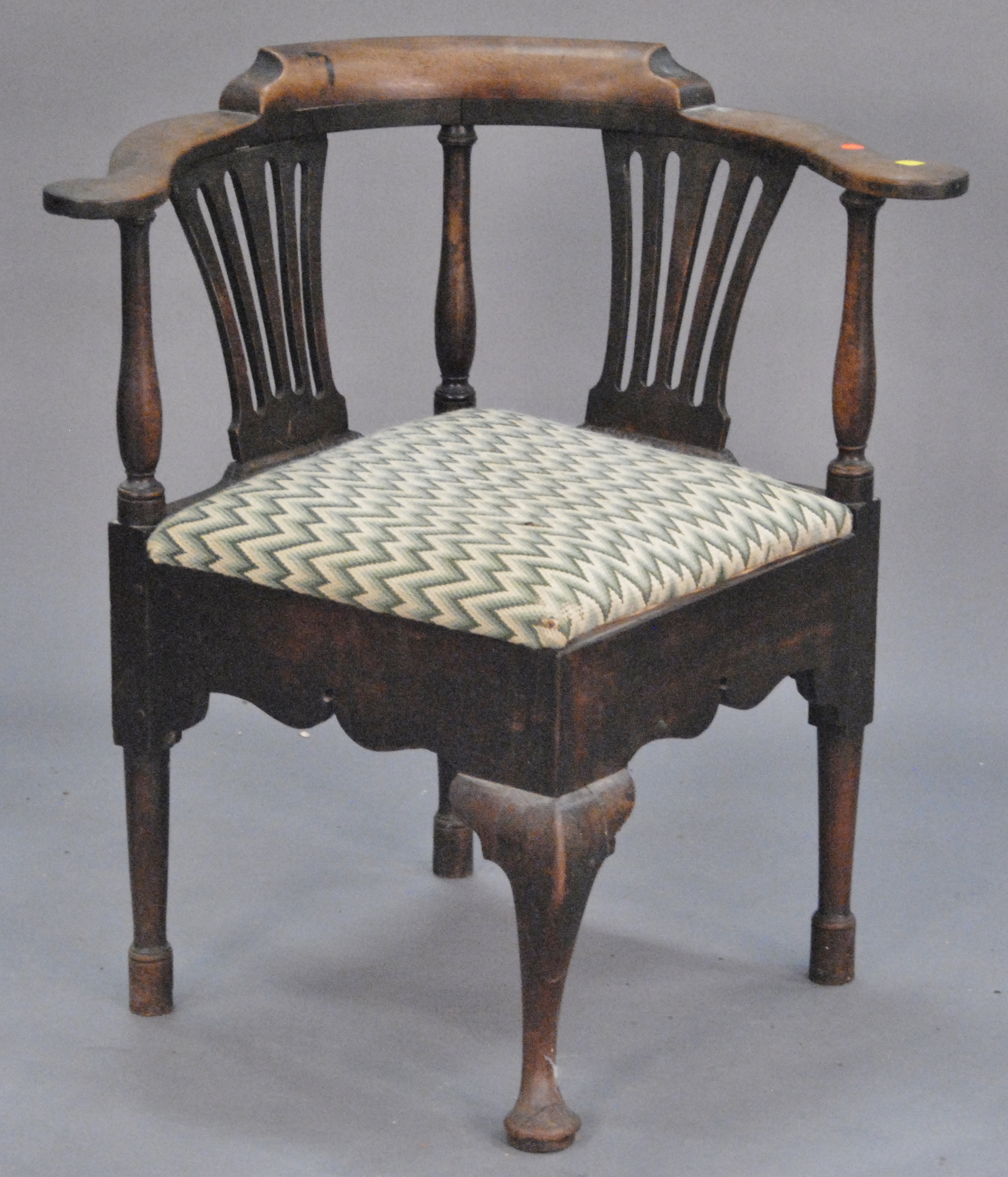 George II mahogany corner chair with pierce carved back, scalloped skirt and cabriole leg ending in pad feet. seat ht. 17 in. Provenance: Property from The Estate of Margaret Oliphant of Old Lyme, Connecticut