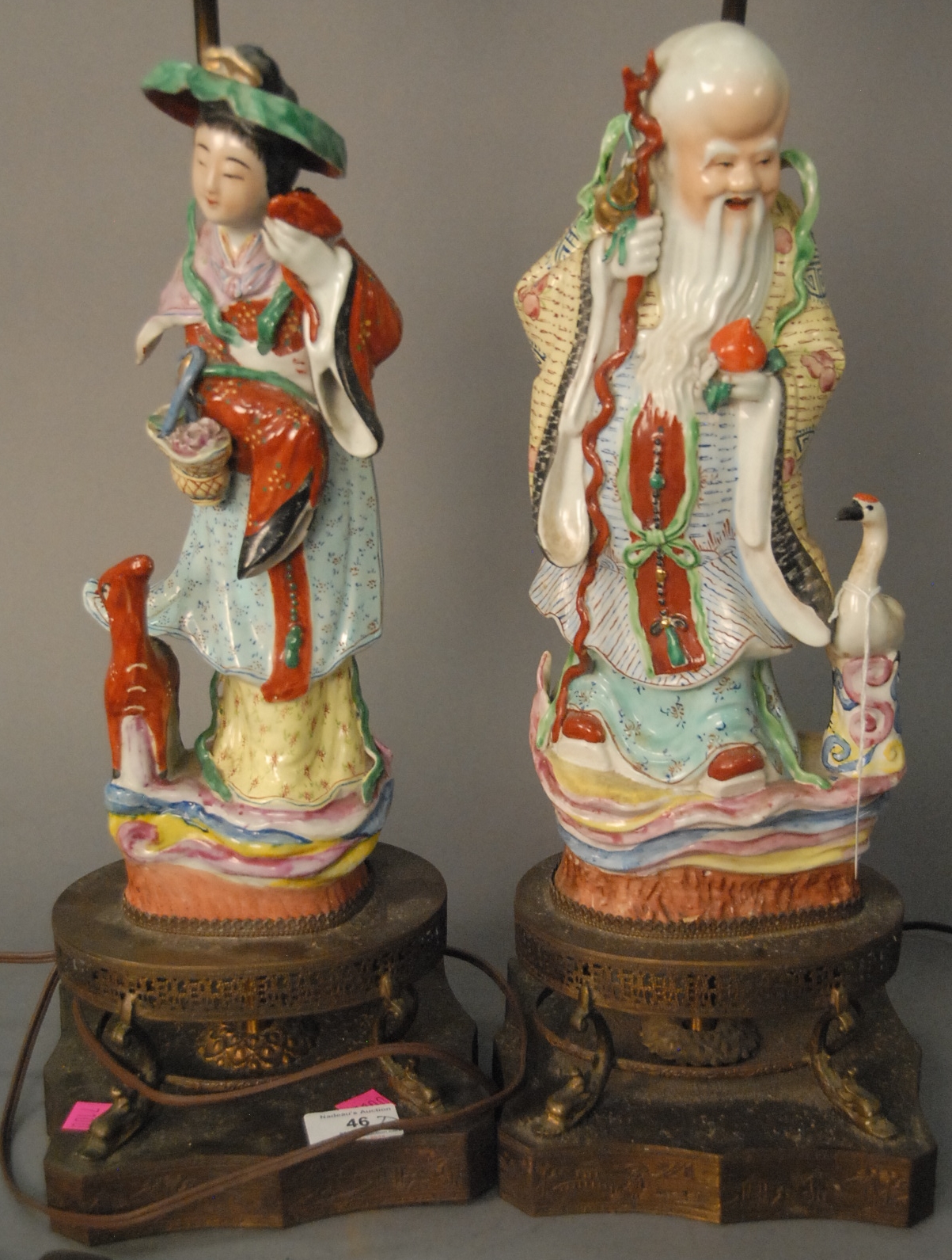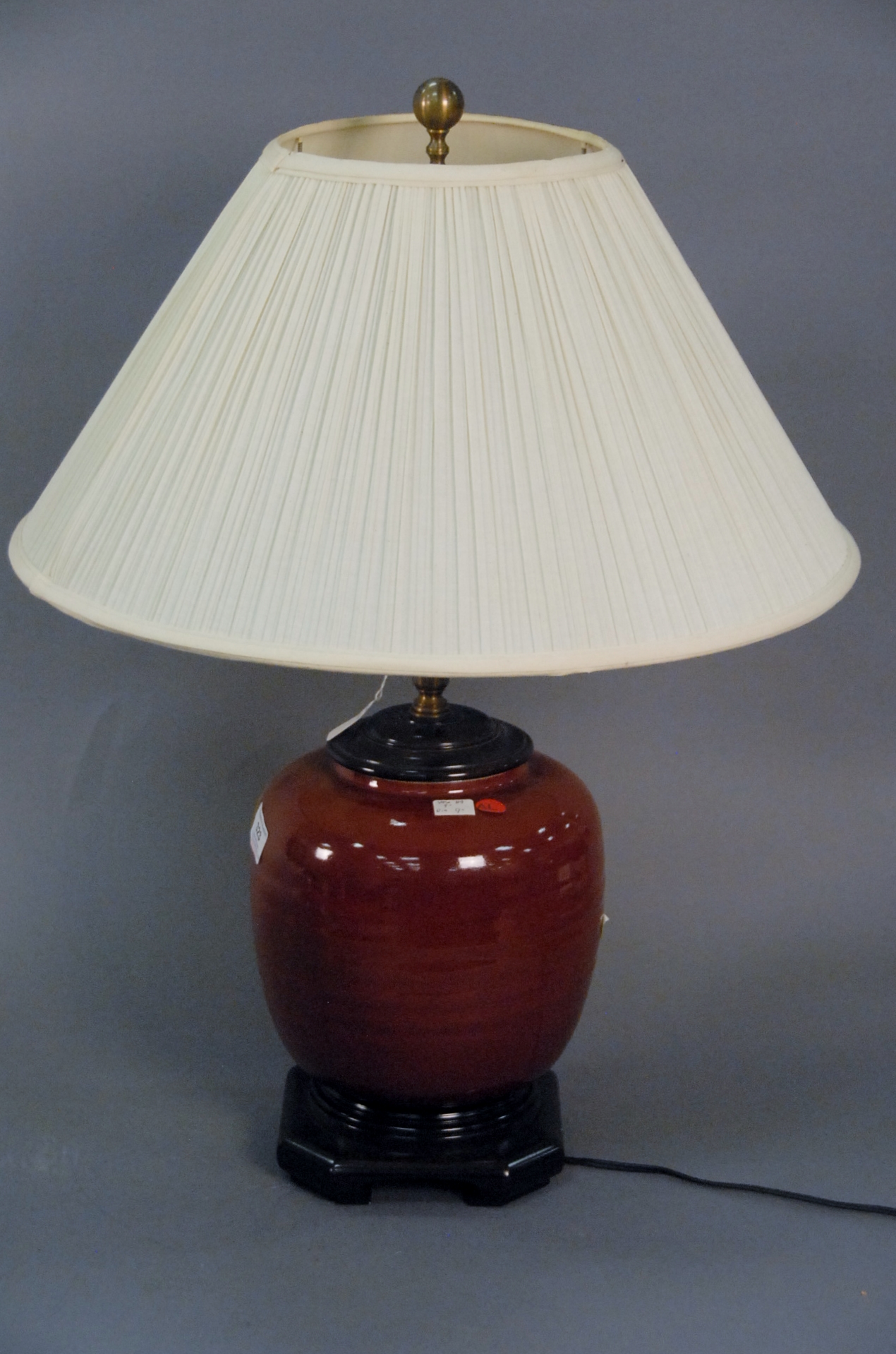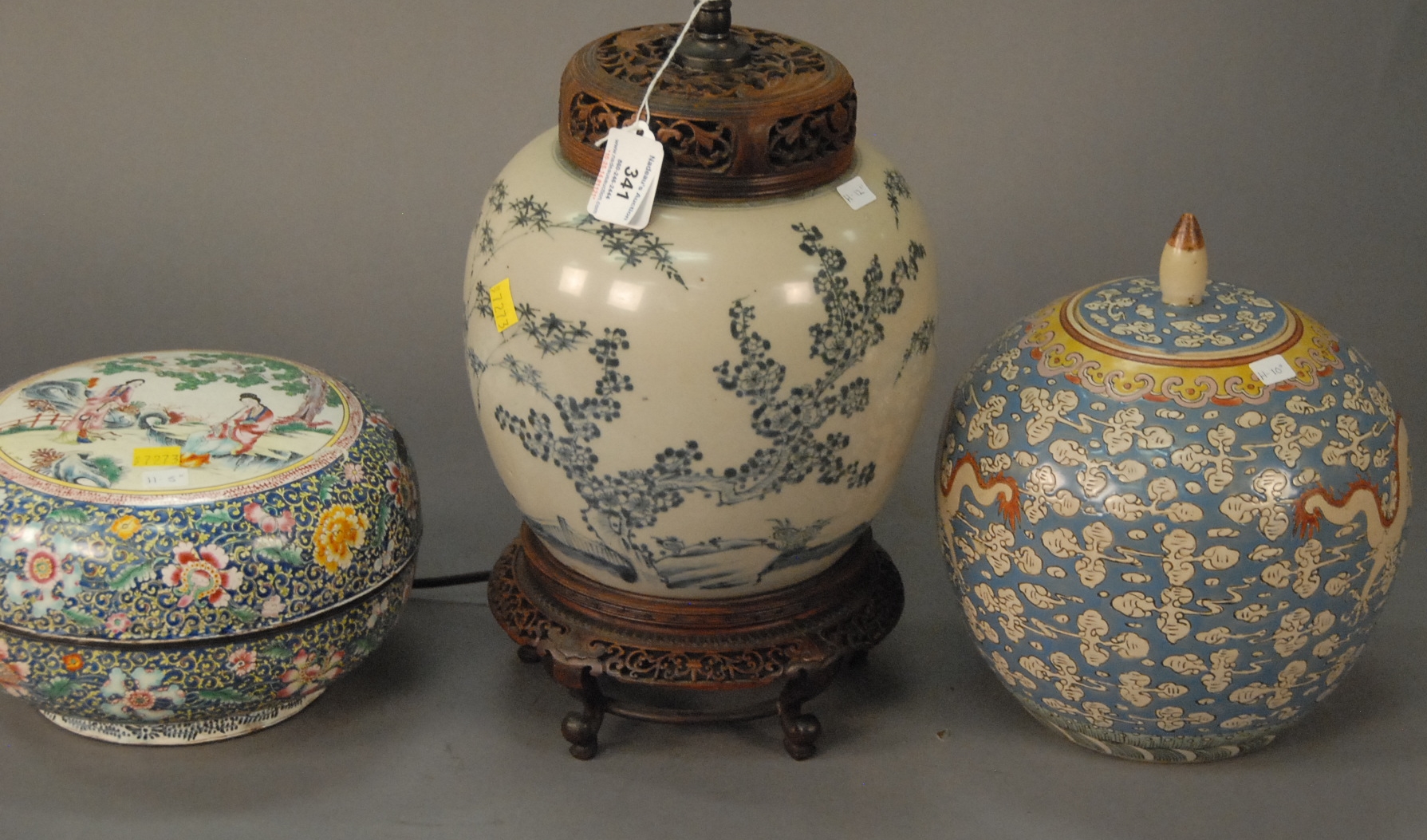 Group of three Chinese jars to include blue and white ginger jar made into a table lamp with carved footed base and reticulated cover, a five claw dragon jar with cover, and an enameled Guanyin covered box with scrolling flower design. box: ht. 5 in. lamp: ht. 12 in. jar: ht. 10 in.