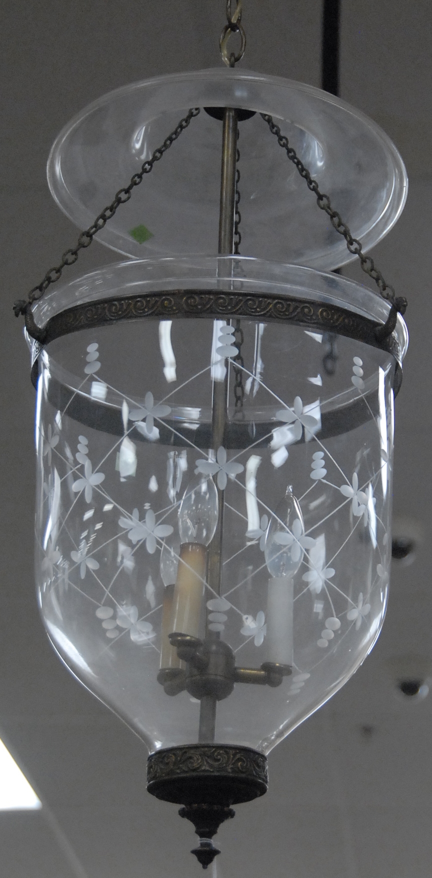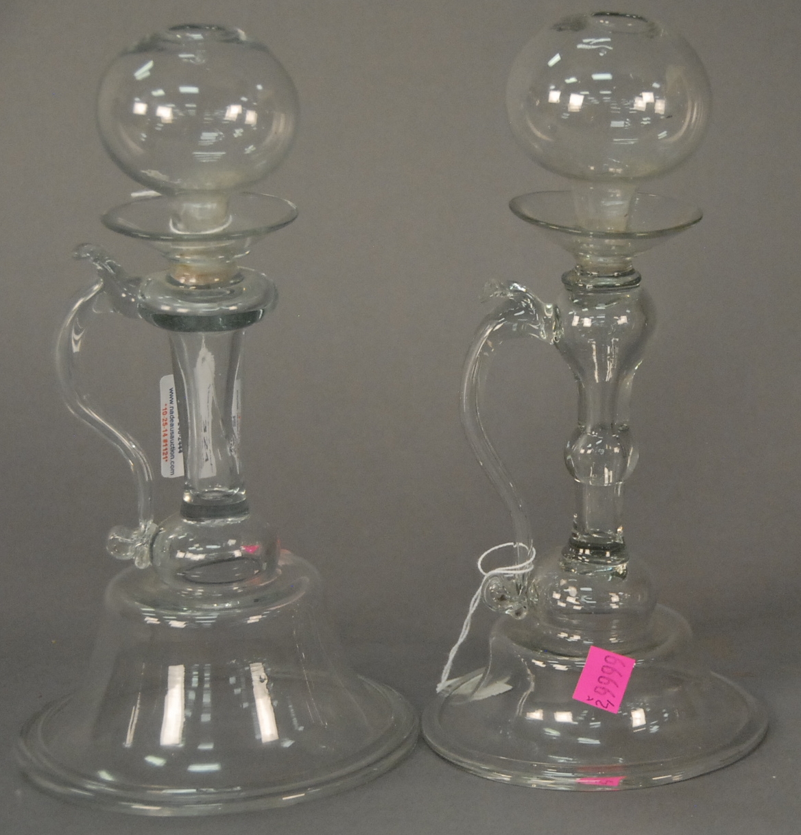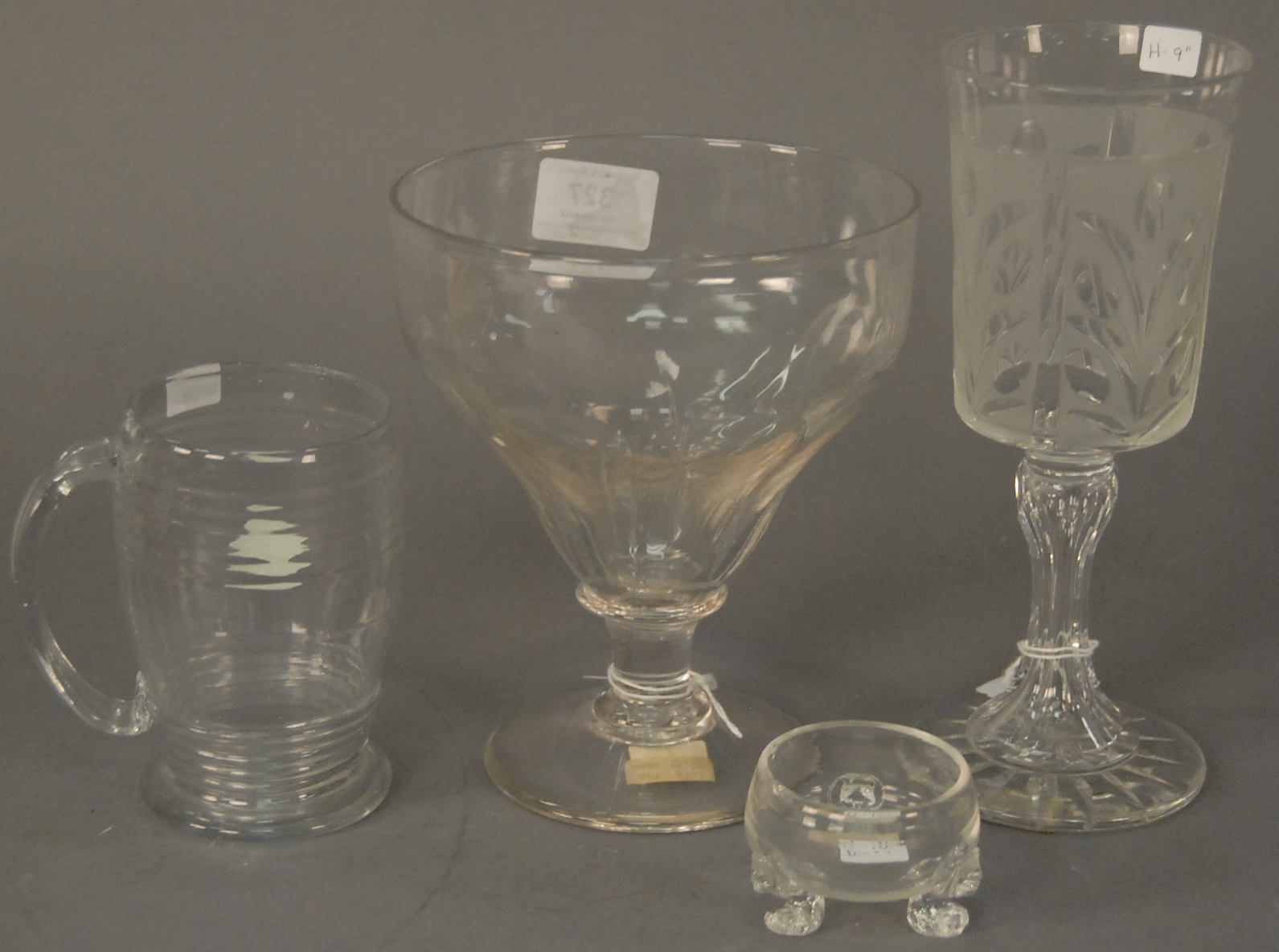 Four piece lot of clear glass to include one tall frosted to clear stem marked French circa 1740, one mug, one salt, and one compote. stem: ht. 9 in. mug: 5 in. Provenance: Property from a Private Collection Sold for the Benefit of the Virginia Historical Society.