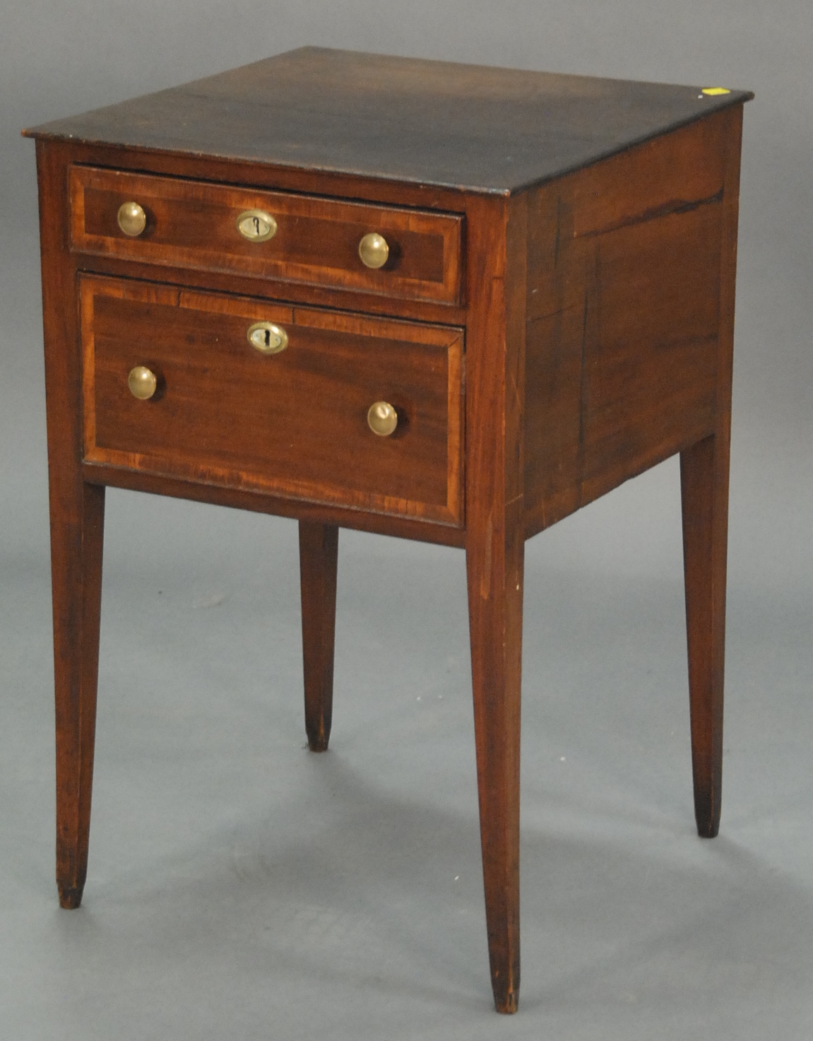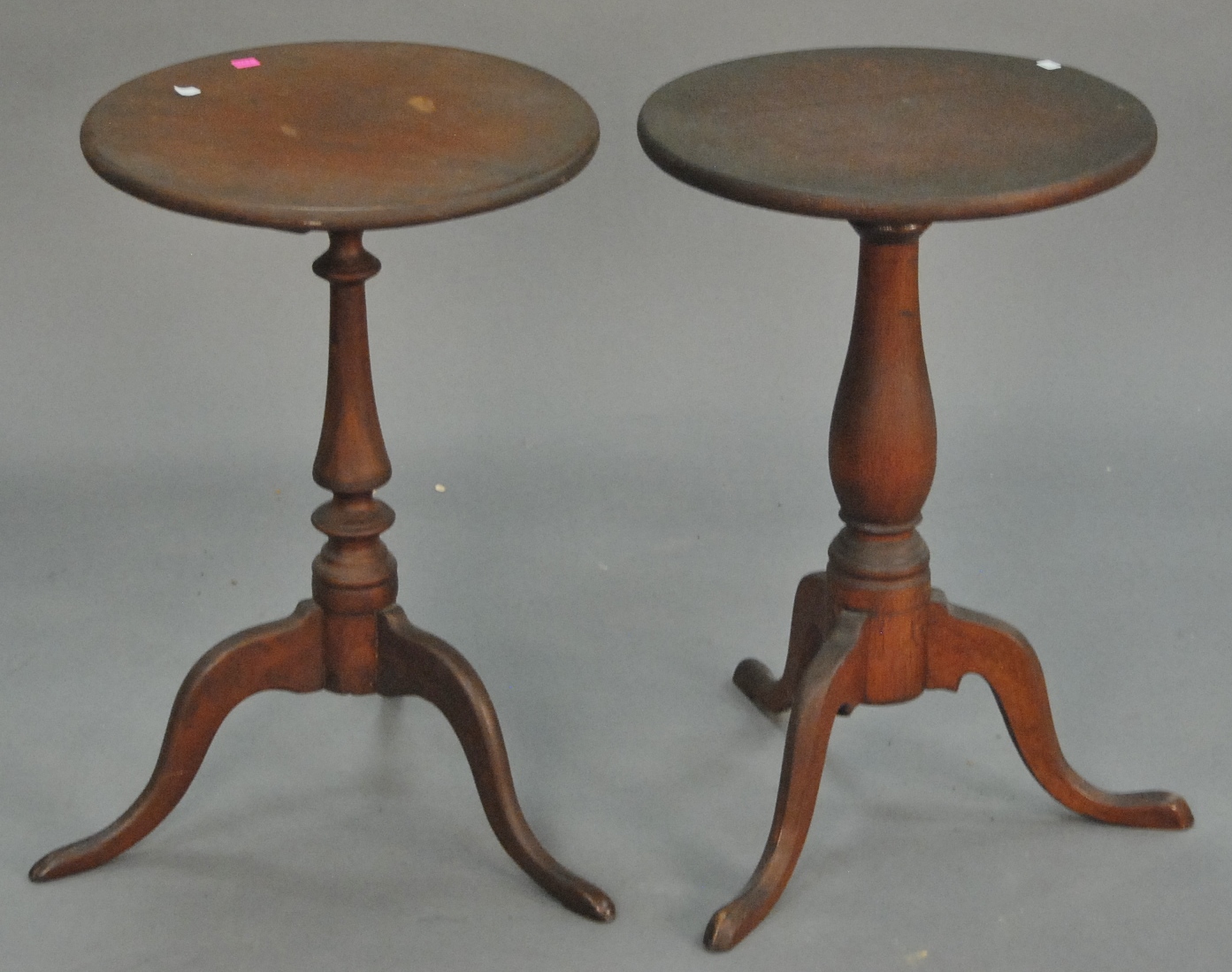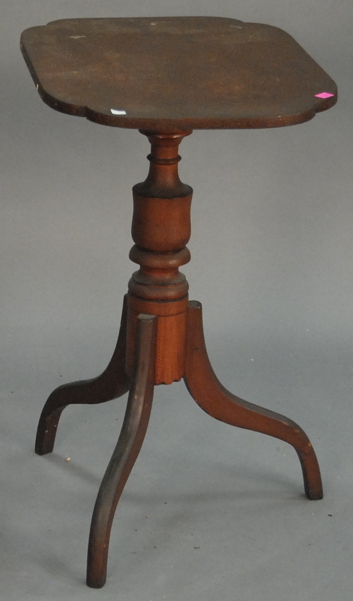 Two piece lot including Federal cherry tip stand having square top on turned shaft ending in tripod base and form top table with old finish. ht. 27 1/2 in. top: 20 1/4 x 20 3/4 and ht. 28 1/2 in. top: 16 x 22 1/2 Provenance: Property from The Estate of Margaret Oliphant of Old Lyme, Connecticut