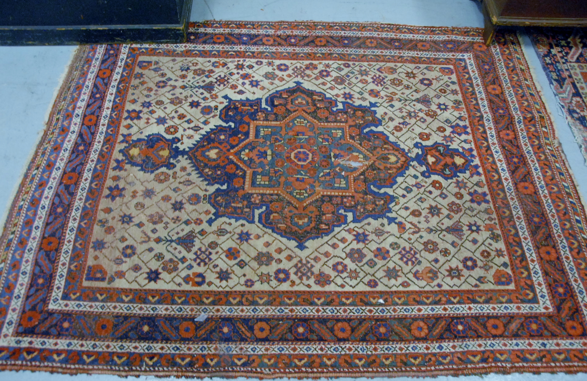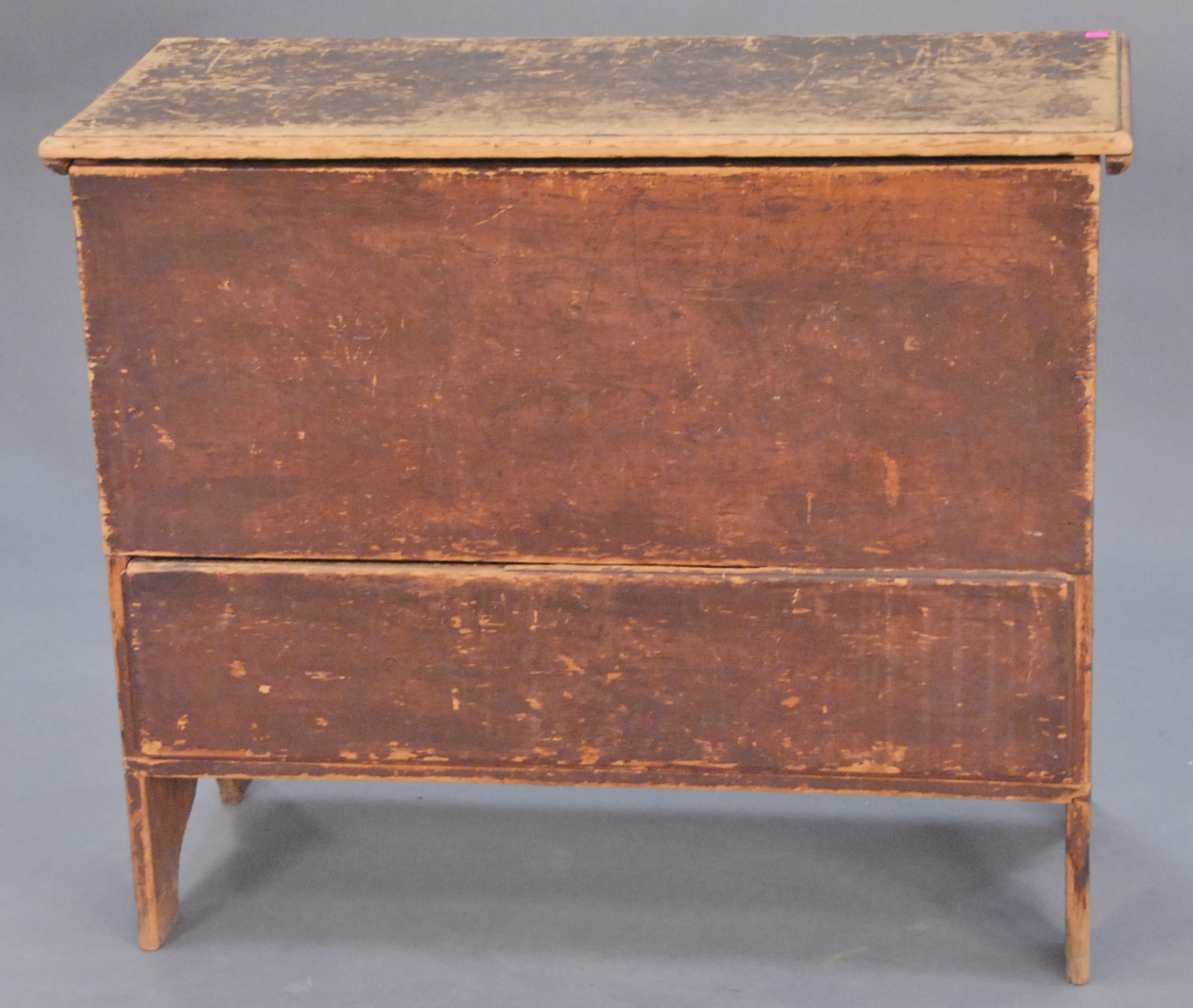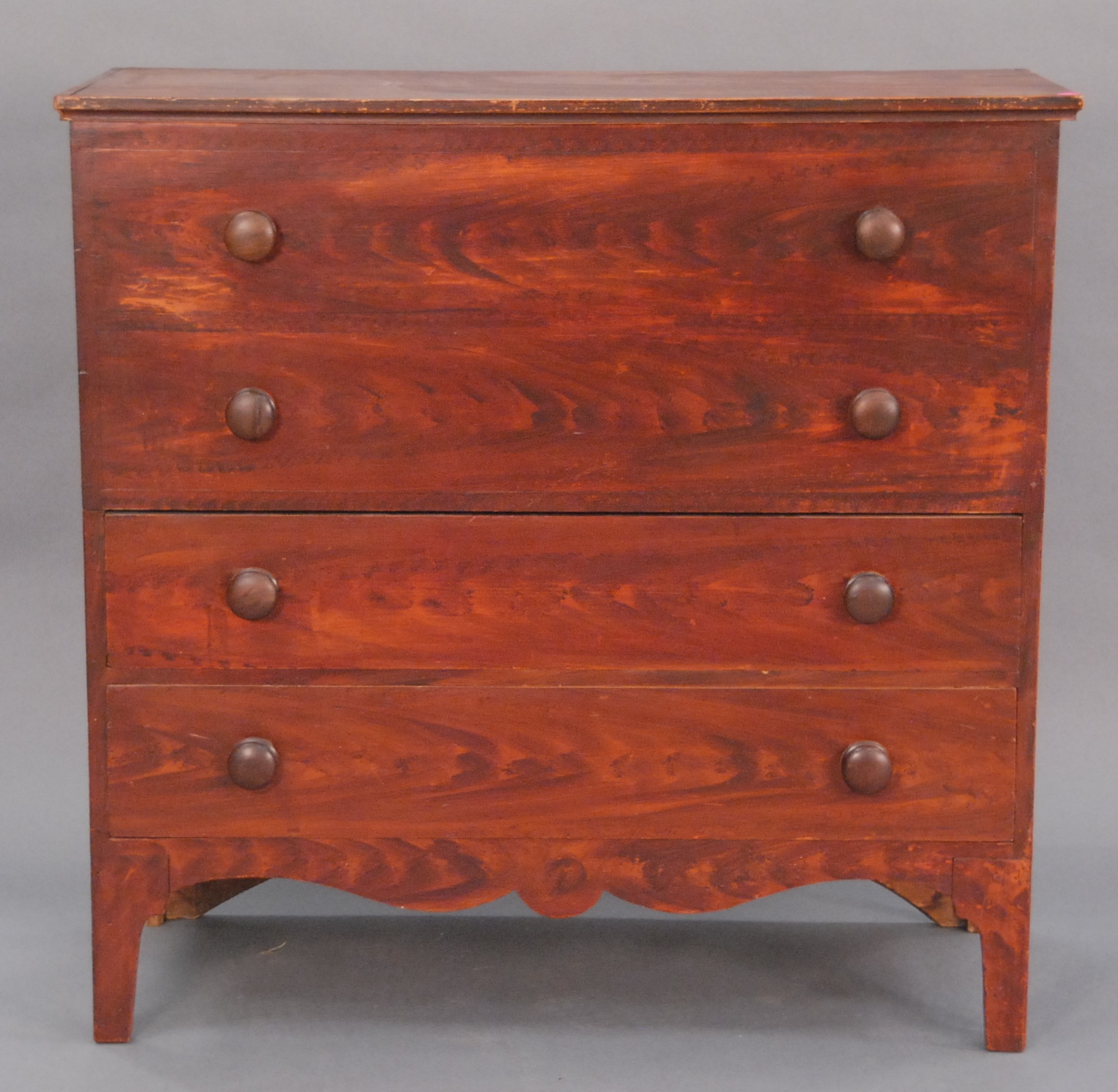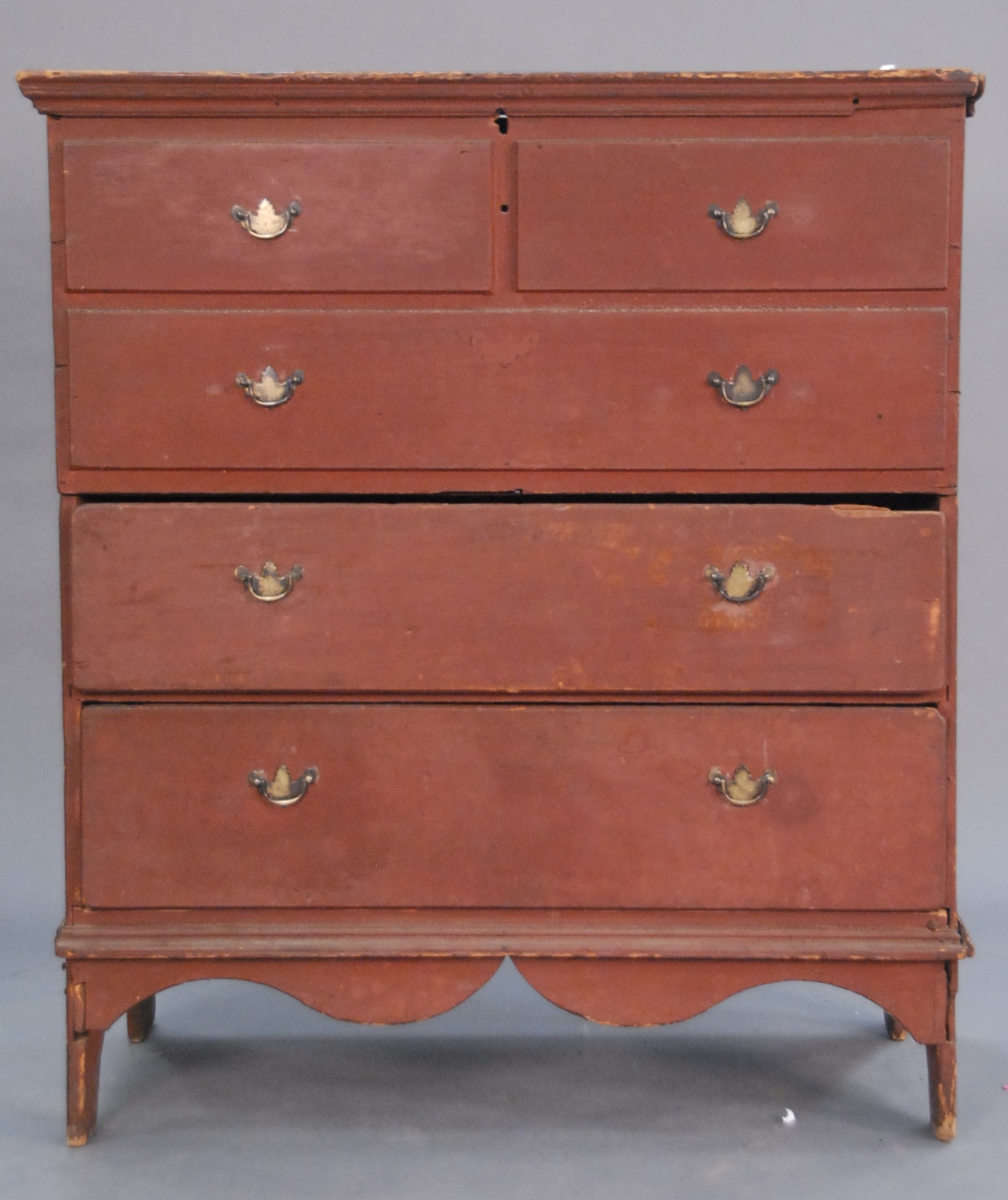 Queen Anne blanket chest with two short false drawers over long false drawer over two drawers with scalloped apron with bootjack ends in old red paint. ht. 46 in. wd. 38 1/2 in.
