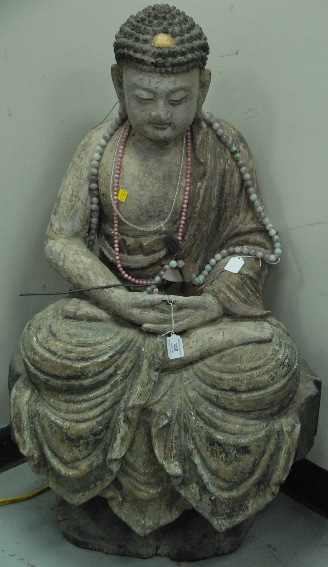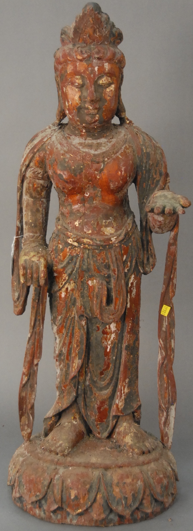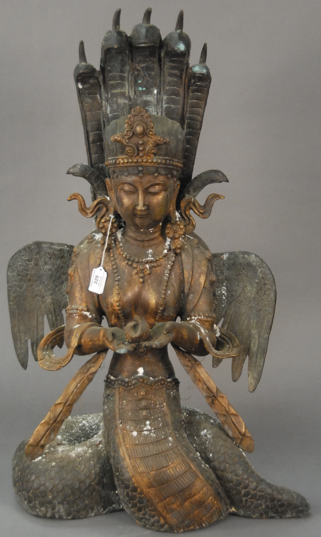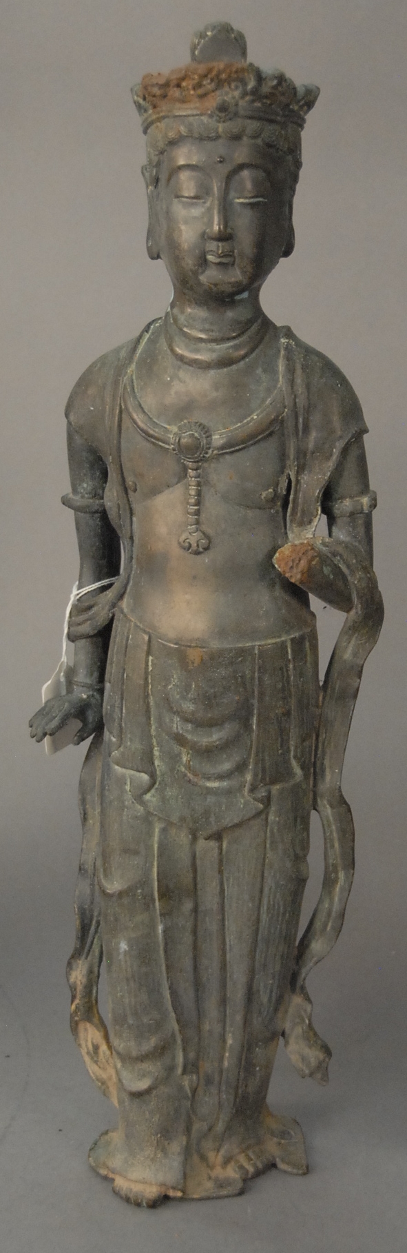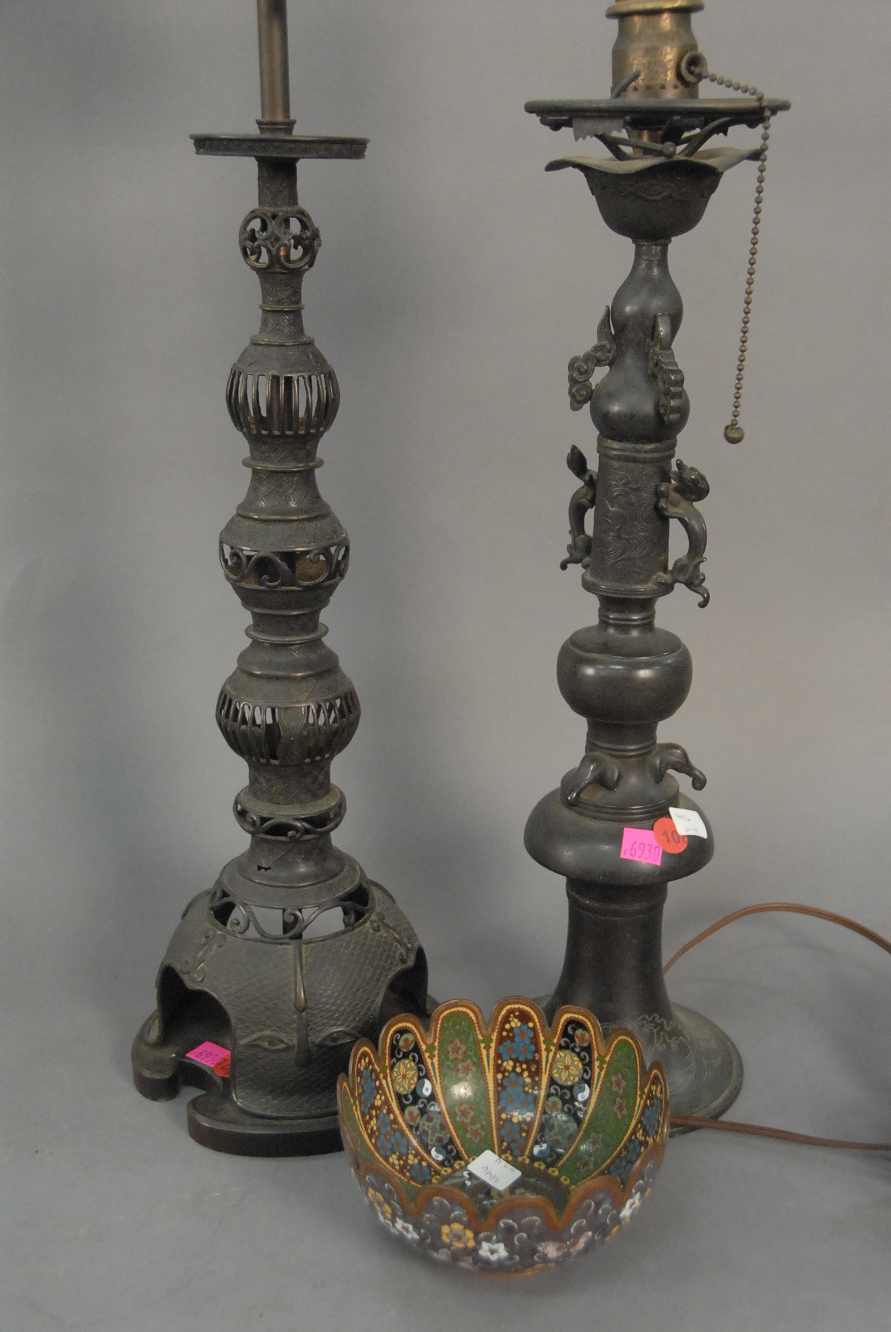 Four piece lot of two pricket candlesticks mounted as lamp, one is four-tiered bronze with archaic animal handles and elephant heads with incised waves on base the other is five-tiered bronze with open-work spheres, archaic tao-tieh decoration on legs with wooden base China, 19th/20th century, cloisenne phoenix bowl, and early carved stone. four-tiered: ht. 19in. five-tiered: ht. 18