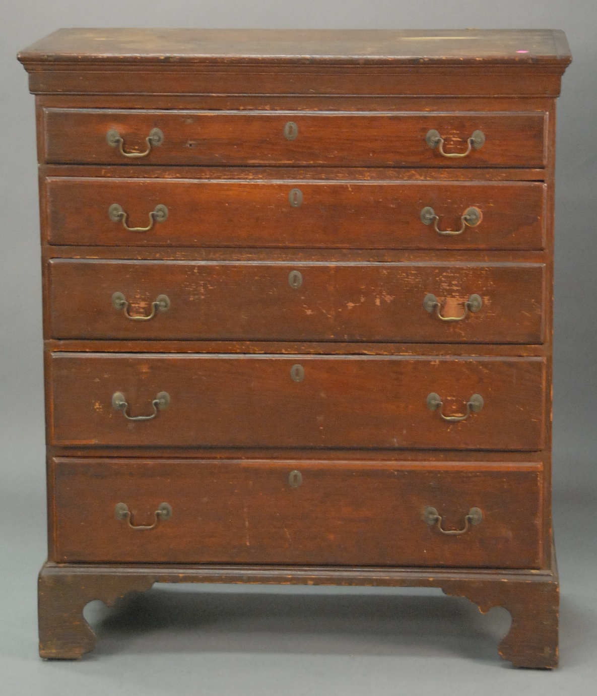 Chippendale chest of five graduated drawers on cut out bracket base. ht. 45 in. wd. 37 in. dp. 17 1/2 in. Provenance: Property from the Estate of Elizabeth and Edward Wallace of The Tracy House in Meriden, Connecticut.