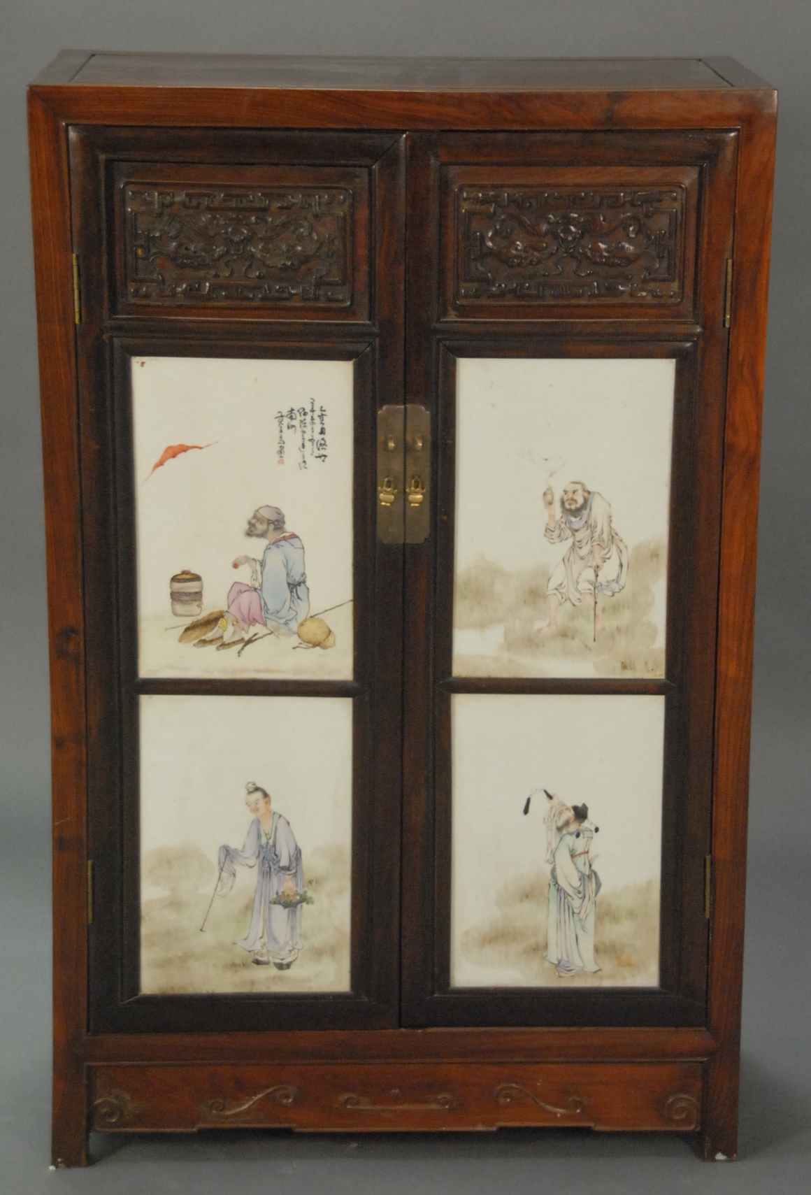 Chinese hardwood two door cabinet having four porcelain painted plaques of scholars, now fitted with vintage stereo equipment inside. cabinet: ht. 51 in. wd. 33 in. dp. 17 in. plaque size: 15 x 10
