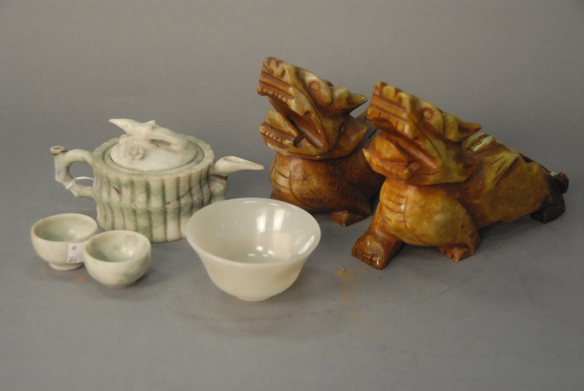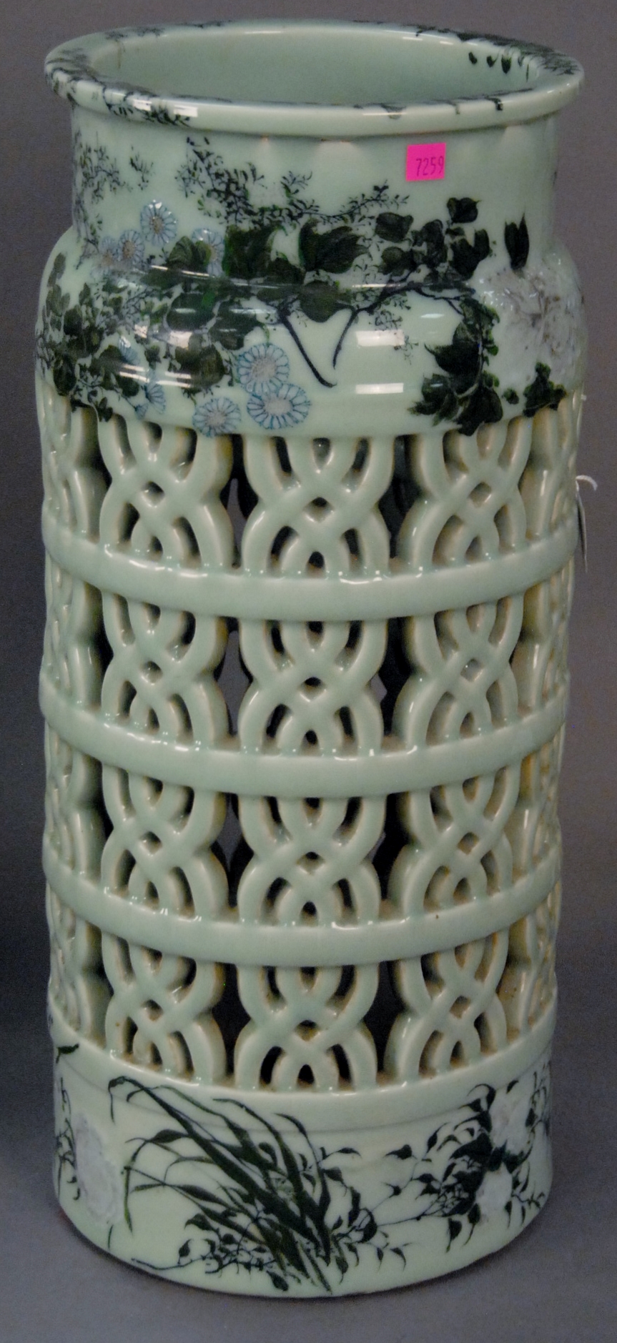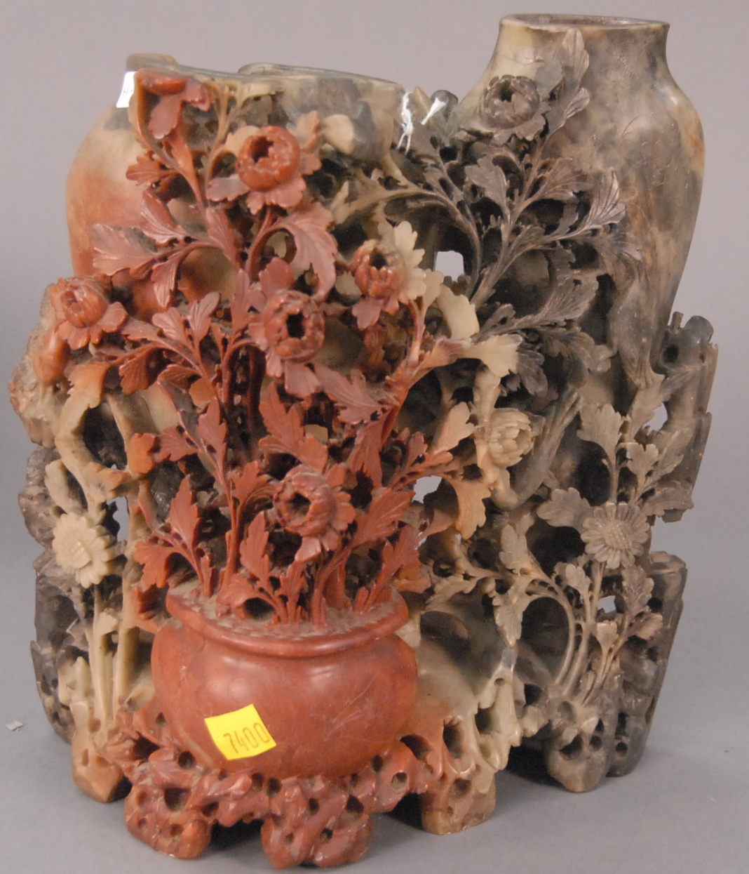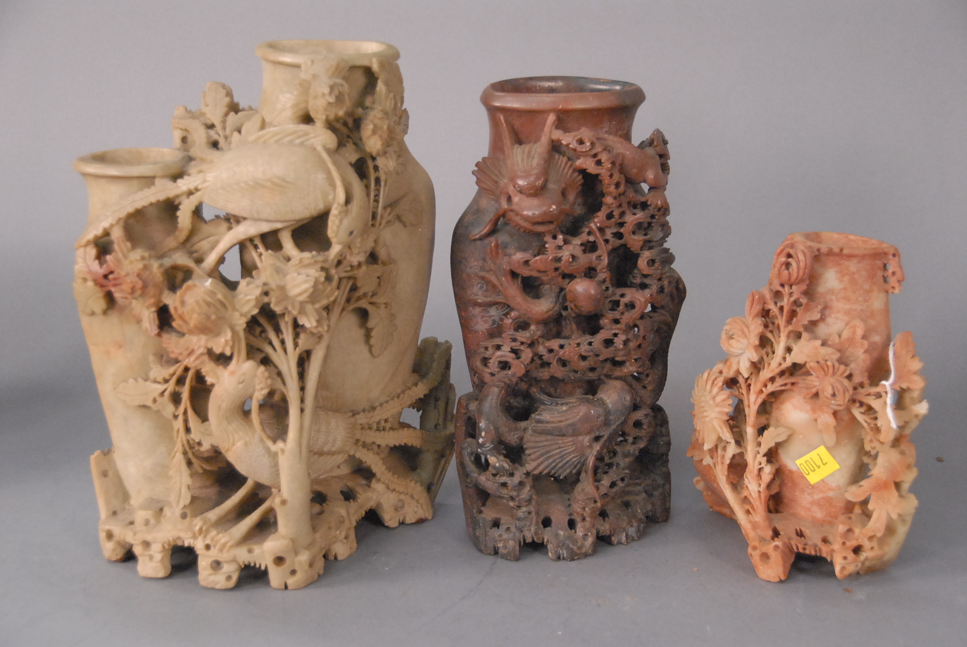 Three large soap stone vases, one with two reticulated carved dragons and flaming clouds, a double vase with blossoming flower and birds, and a small double vase with flowers. ht. 7 1/2 in., ht. 10 3/4 in., & ht. 11 in.