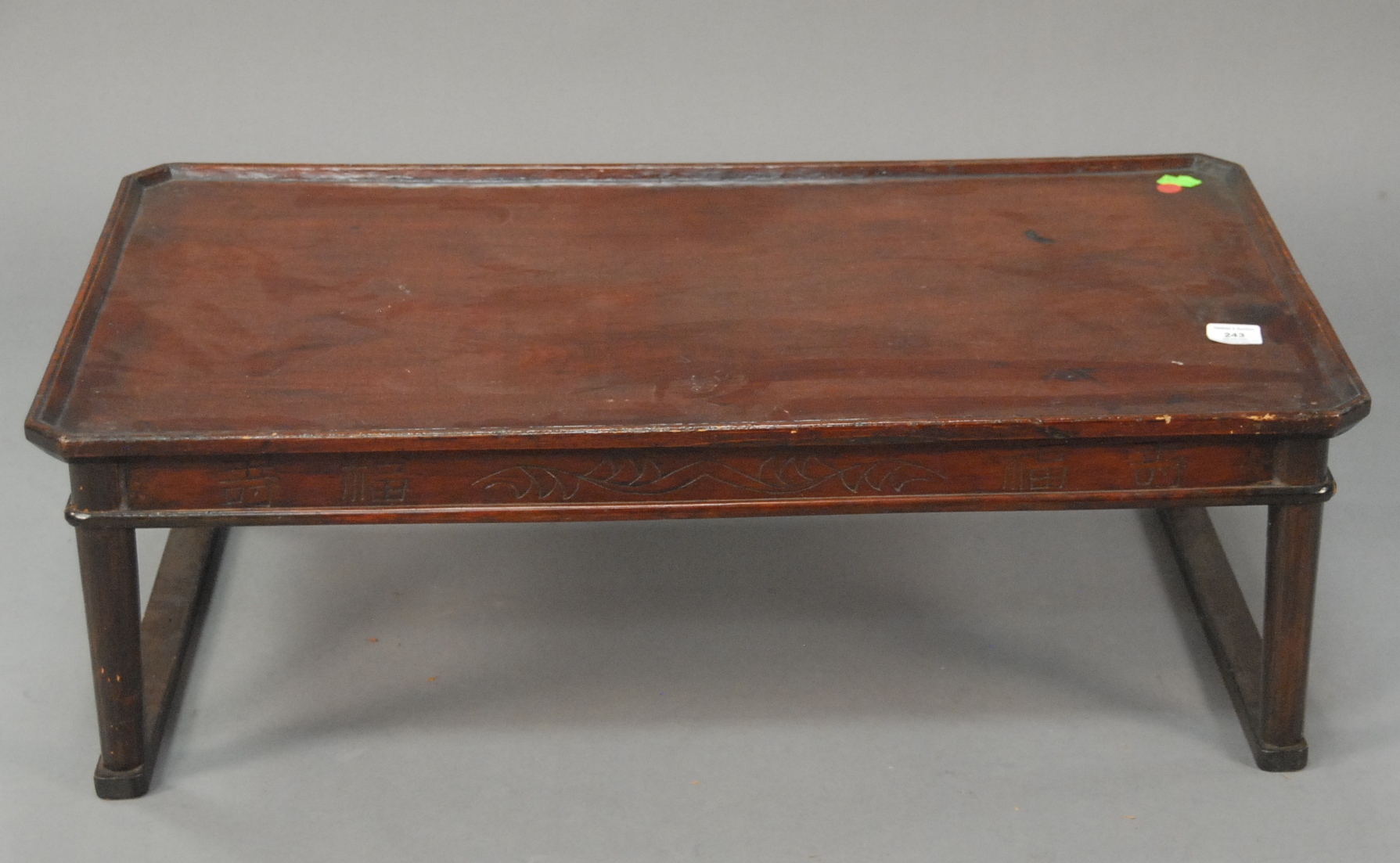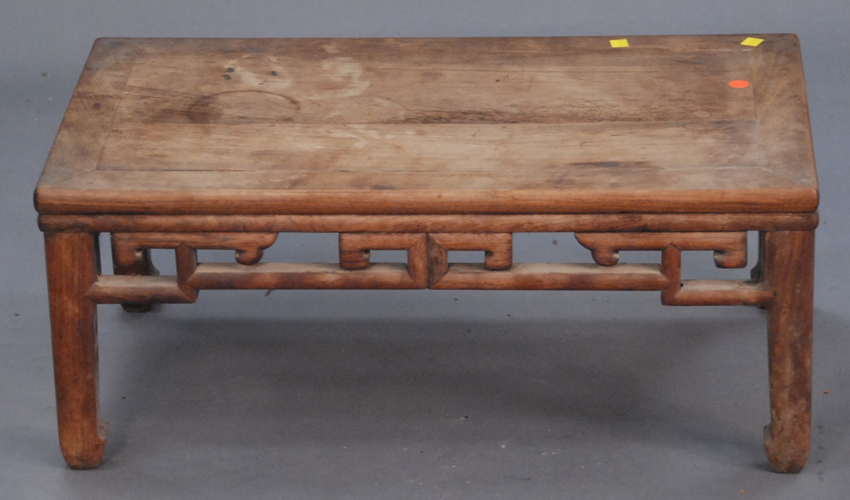 Oriental hardwood low table with key design carved skirts. ht. 12 in. wd. 28 in. dp. 16 in. Provenance: Property from The Estate of Margaret Oliphant of Old Lyme, Connecticut
