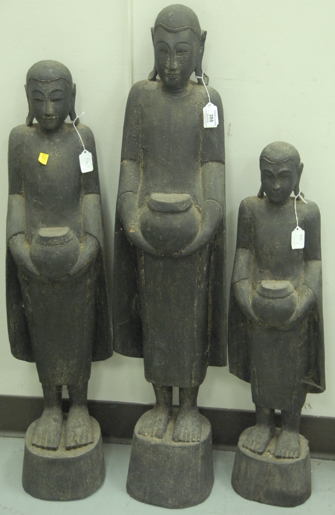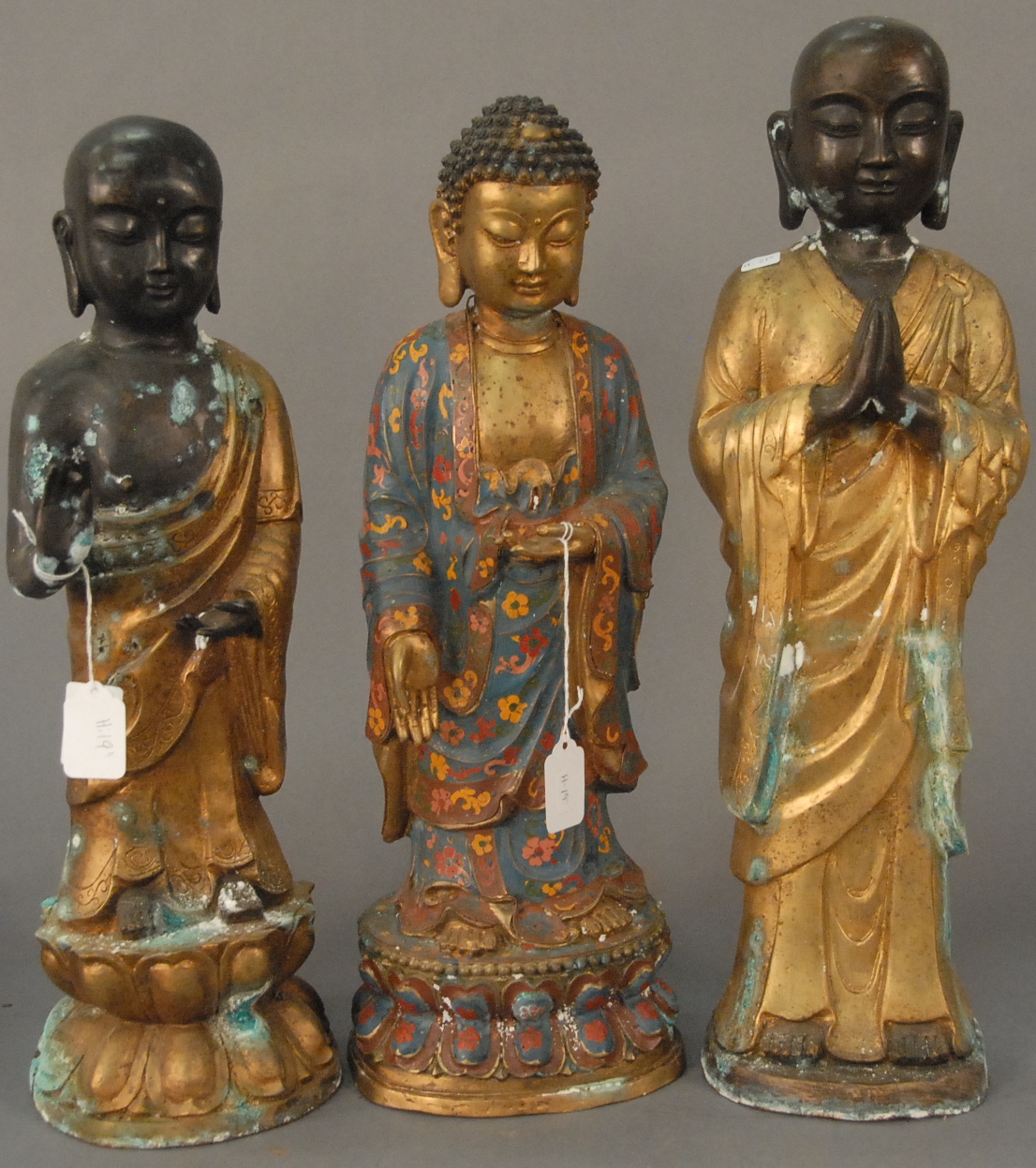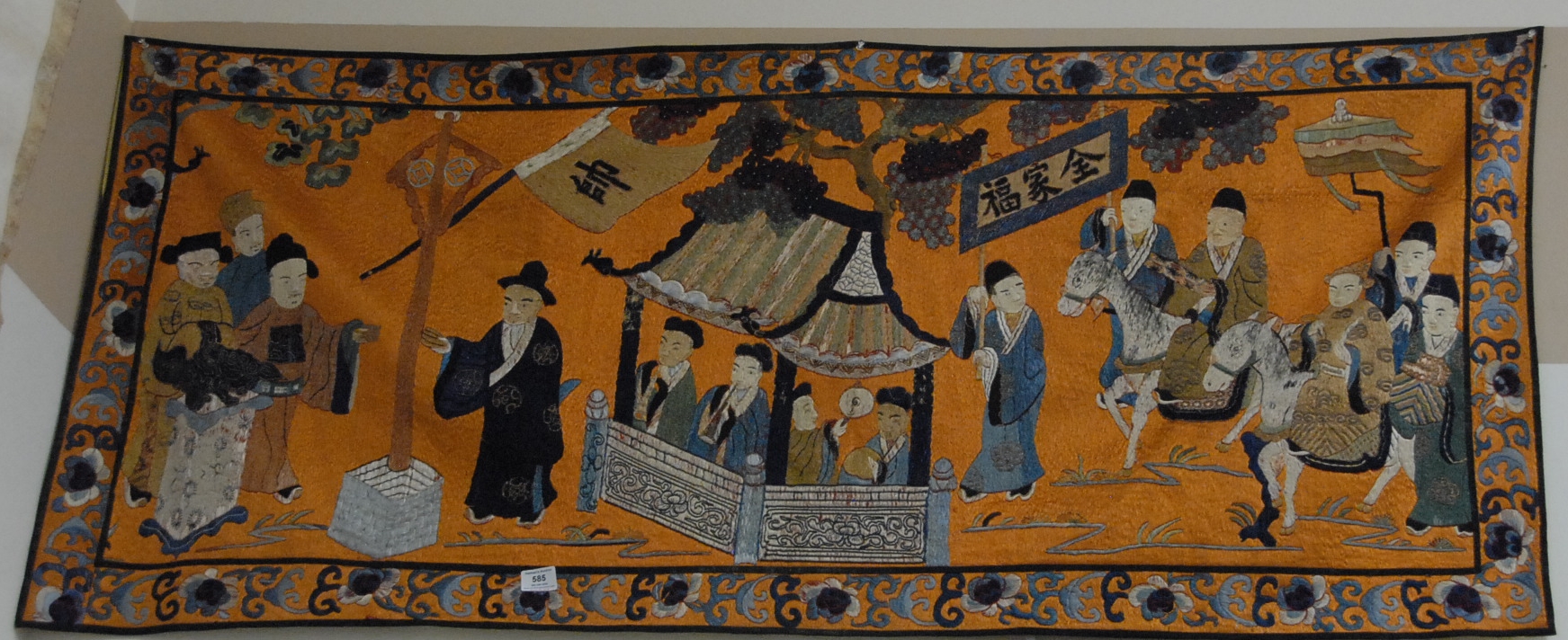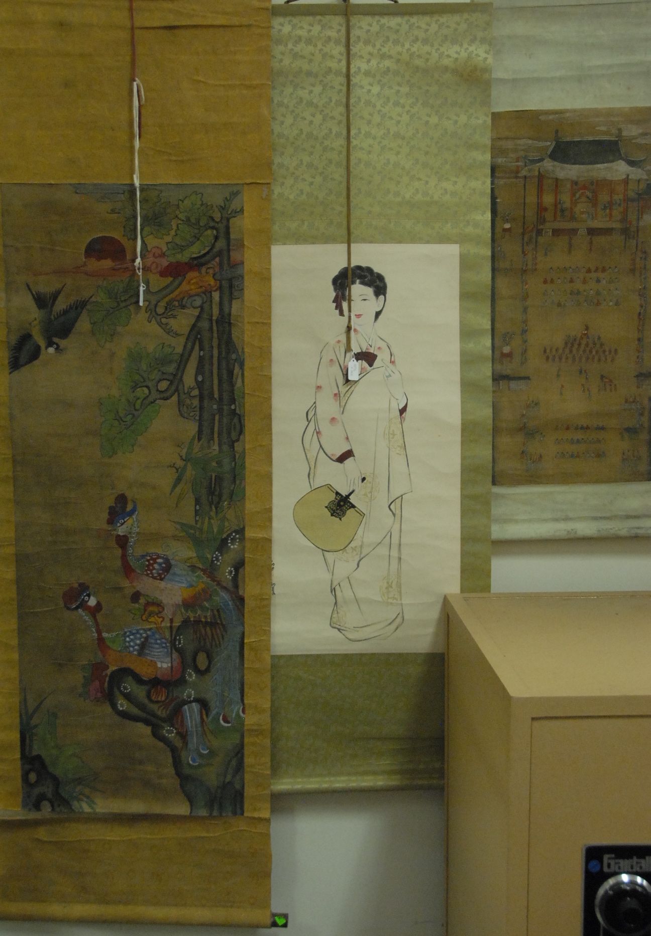 Group of three Oriental scrolls including watercolor on silk of assembly, watercolor on paper of Guanyin, and watercolor on paper of peacocks perched in tree. 30 x 14, 33 x 18, & 32 x 19