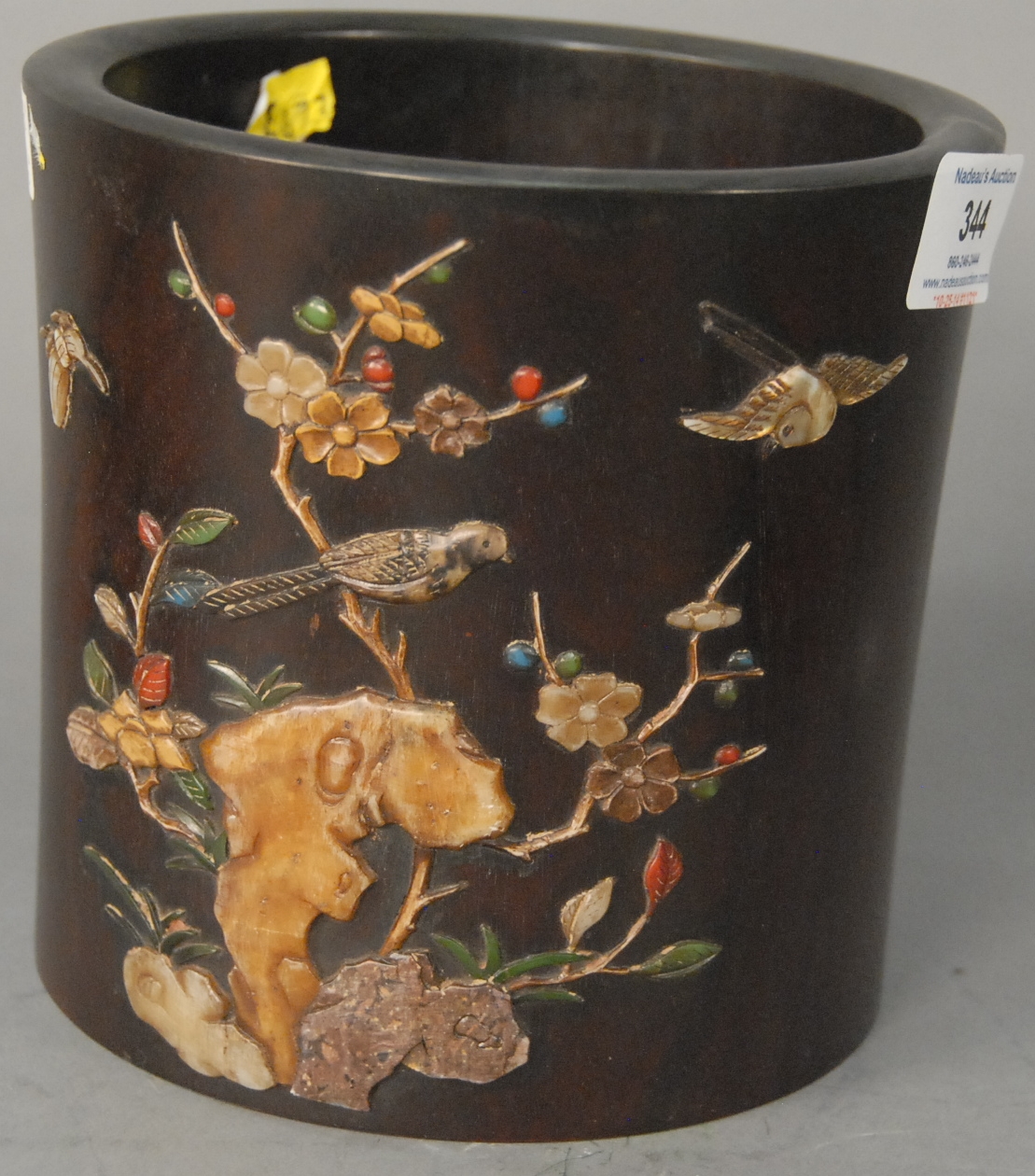 Hardwood brush pot mounted with coral, hard stone, and mother of pearl made into flowers and birds having character marks made of bone on back, ht. 6 1/2in. dia. 6 1/2in..