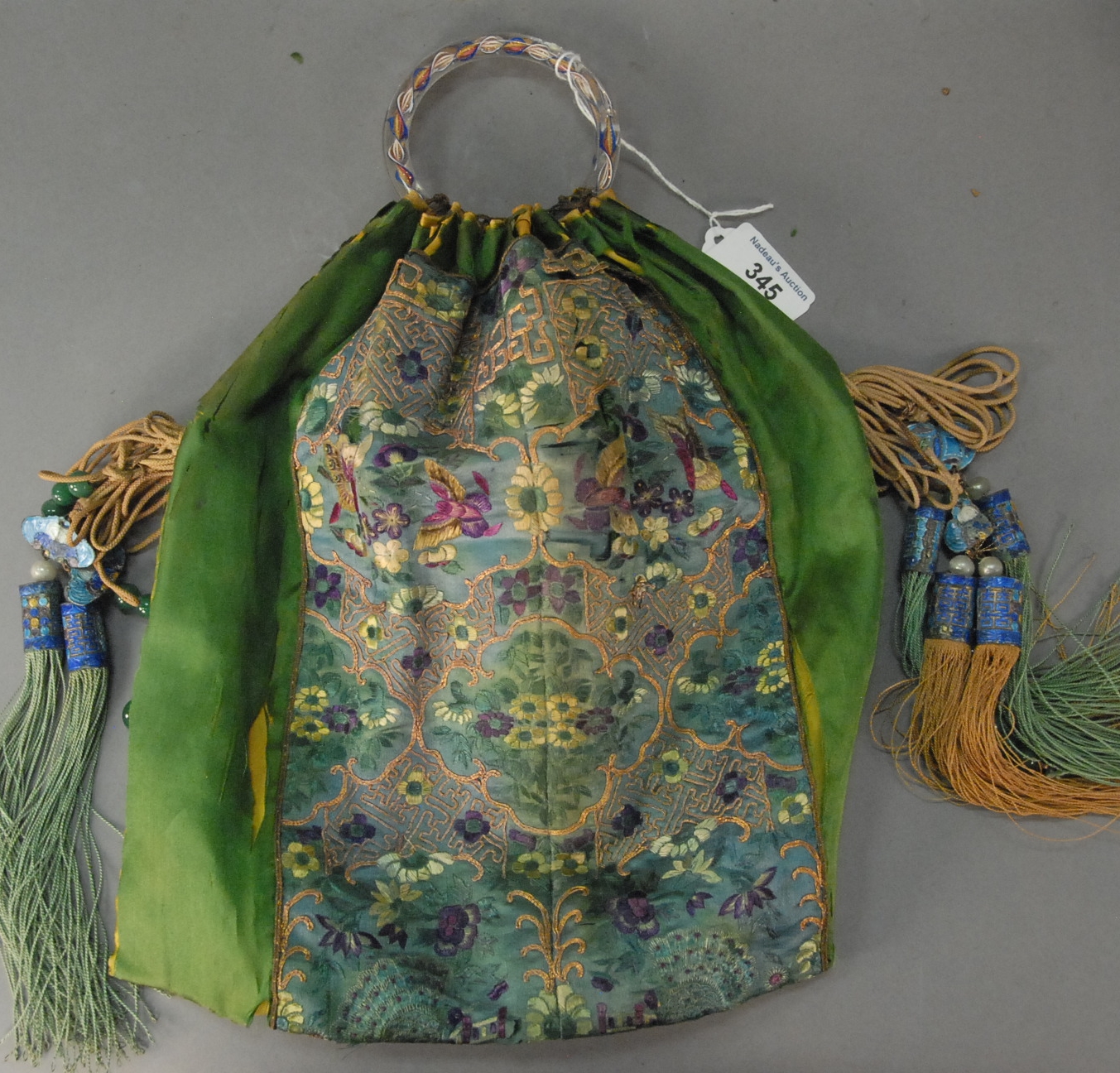 19th Century silk bag pouch needlepoint decorated with silk and gold threads, handles made from twisted glass bracelets, bag decorated with enameled and jade tassels.