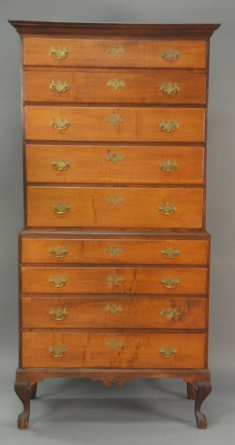 Chippendale chest on chest, maple and figured maple in two parts, upper section with cornice molded top over five graduated drawers on lower section with four graduated drawers set on base with short cabriole legs ending in claw and ball feet. ht. 79 in. wd. 36 in. dp. 19 1/4 in. Provenance: Property from the Estate of Elizabeth and Edward Wallace of The Tracy House in Meriden, Connecticut.