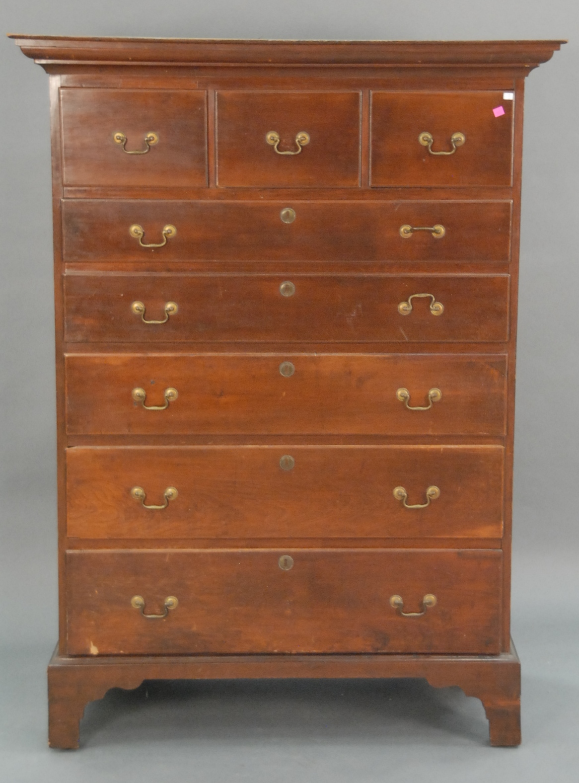 Chippendale tall chest having large cornice molded top over three drawers over double drawer over three drawers all set on cut out bracket base, 18th century. ht. 61 in. wd. 39 in. dp. 18 in.