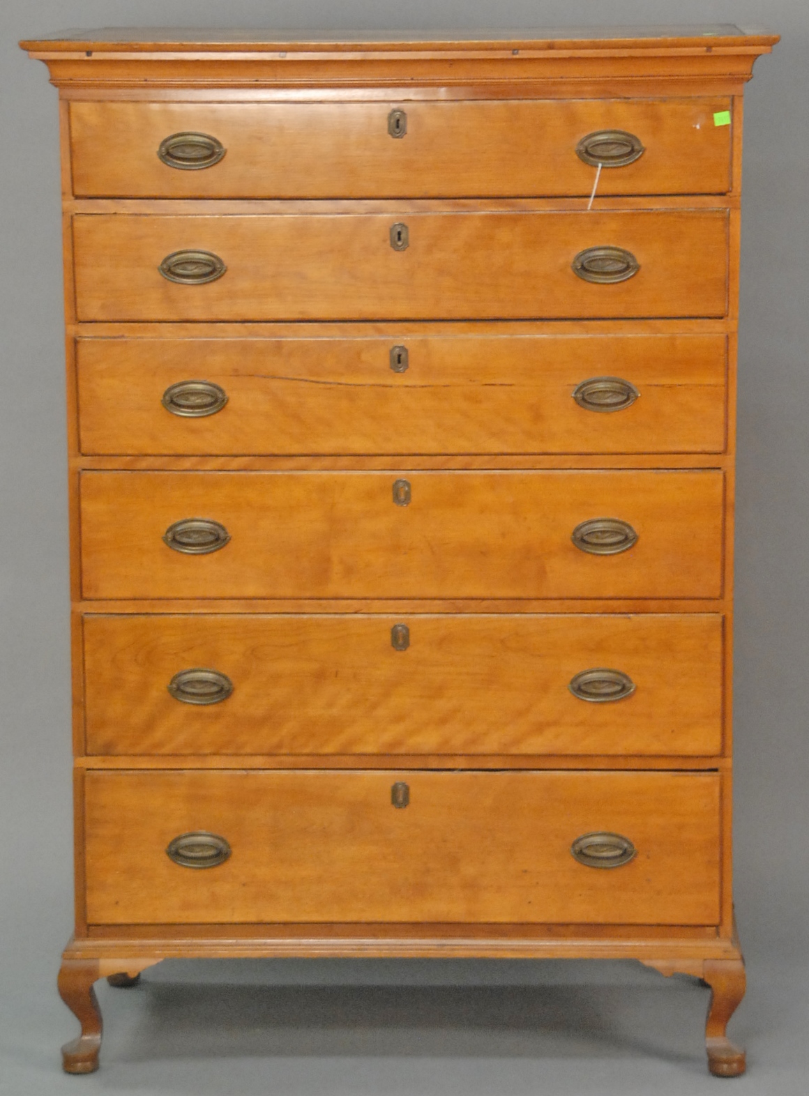 Six drawer tall chest having large cornice molding over six graduated drawers all set on short brandy legs, original hardware, 18th century. ht. 58 in. wd. 37 in.