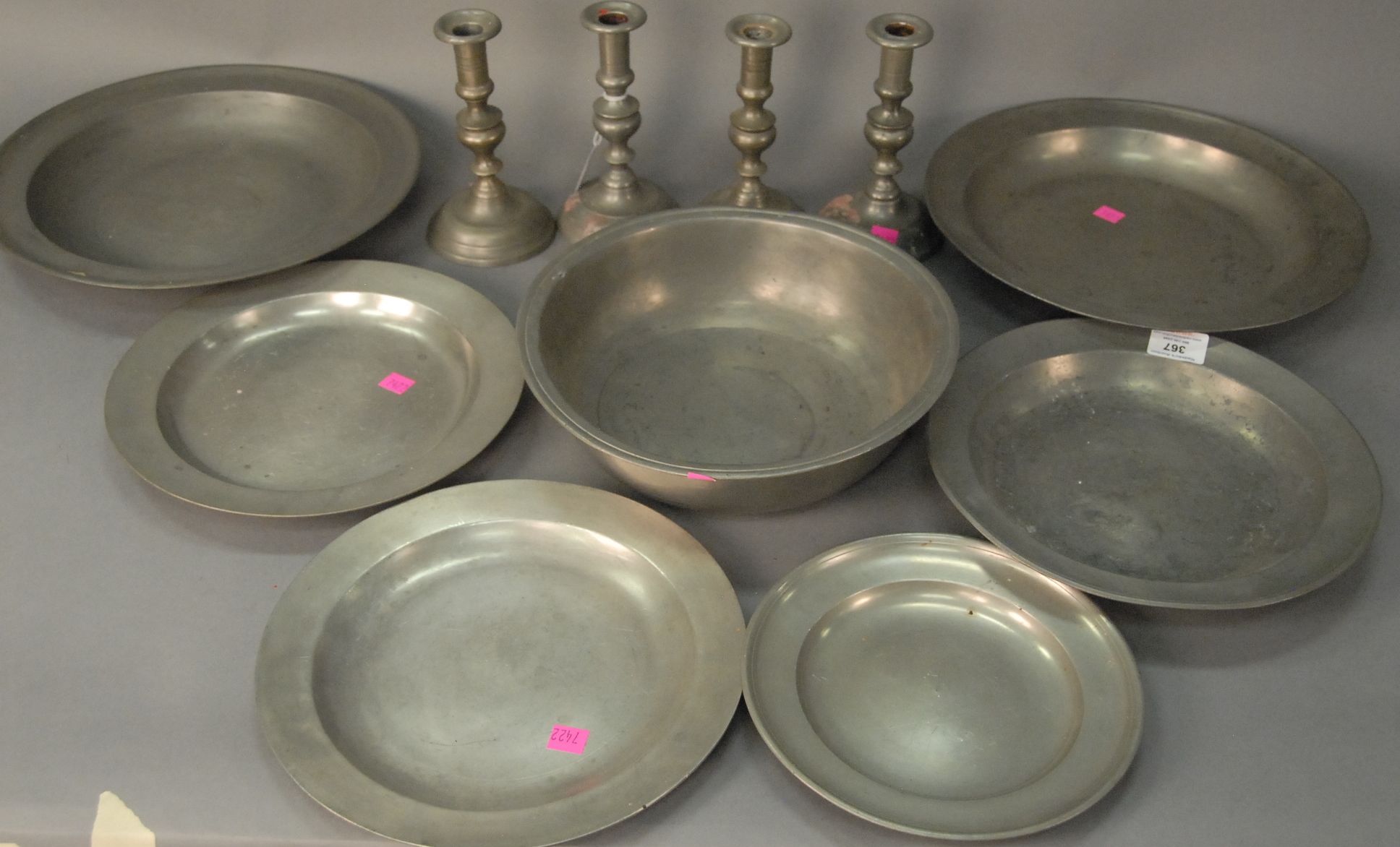 Eleven piece pewter lot including three deep chargers, one basin, and set of four pewter push-up candlesticks. Provenance: Property from the Estate of Elizabeth and Edward Wallace of The Tracy House in Meriden, Connecticut.
