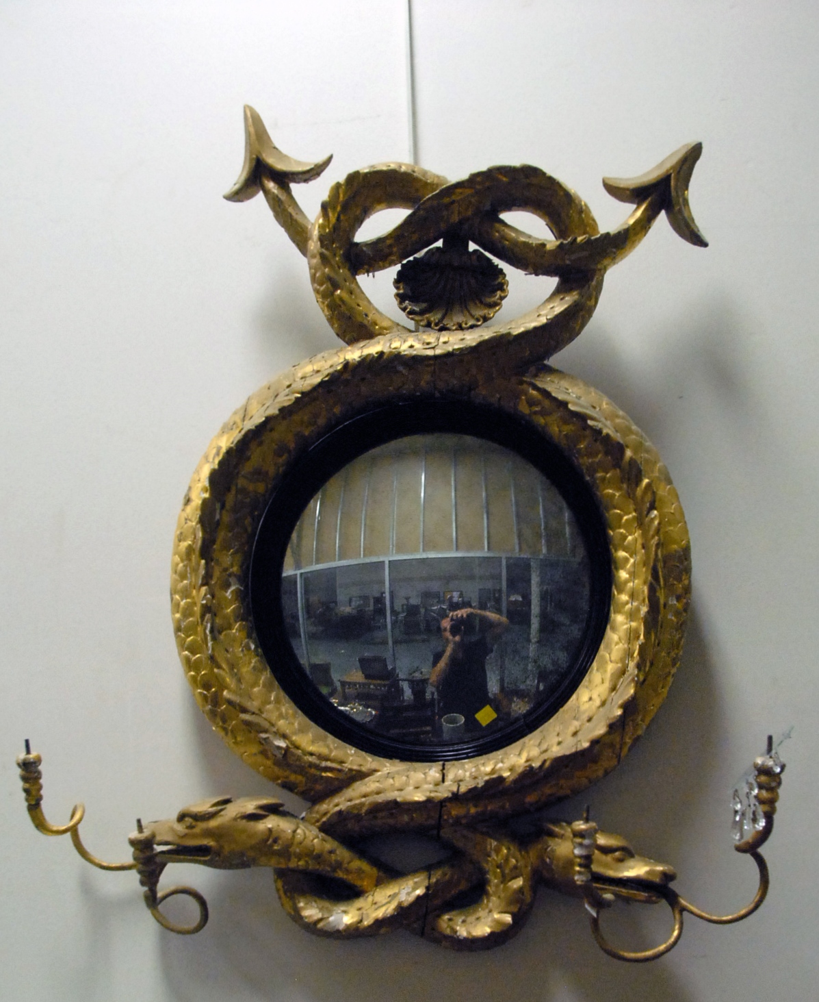 Federal girandole mirror having two serpent surround, each head with dual candle holder regilt finish. ht. 38 in. Provenance: Property from The Estate of Margaret Oliphant of Old Lyme, Connecticut