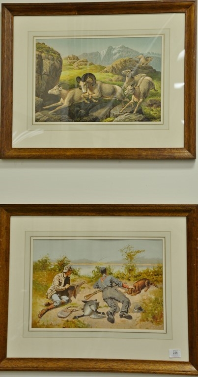 Set of three chromolithographs from American Sporting Scenes published Bradlee Whidden, Edward Knobel Hunting Running Rams, Frank H. Taylor Bringin in a Pike, and Frederic Remington Duck Hunters with Retriever, sight size 12 x 17 3/4. Provenance: Property from Credit Suisse’s Americana Collection