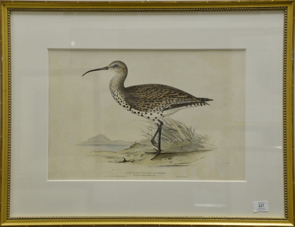 John Gould 1804-1881, three of hand colored lithographs, Slender Billed Curlew Numenius Tenuirostris, printed by Hullmandel, sight size 14 x 21 Calcophasis Ellioti, sight size 14 3/4 x 22 Avocet, printed by Hullmandel, sight size 14 x 21 Provenance: Property from Credit Suisse’s Americana Collection