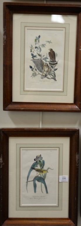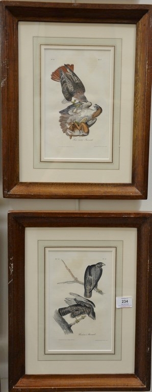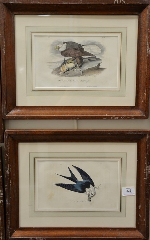 Set of six Audubon prints, Drawn from nature by J.J. Audubon, printed by J.T. Bowen, Philadelphia, hand colored lithographs, Peregrine Falcon Bald Eagle Swallow-tailed Hawk Cooper’s Hawk Red-headed Turkey Vulture Rough-legged Buzzard Black Vulture/Carrion Crew, sight size 9 1/2 x 6, 6 x 9 1/2 Provenance: Property from Credit Suisse’s Americana Collection