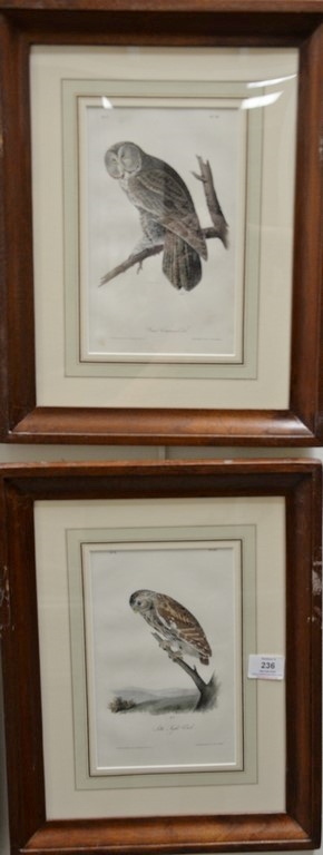 Set of six Audubon prints, Drawn from nature by J.J. Audubon, printed by J.T. Bowen, Philadelphia, hand colored lithographs, Great Cinereous Owl Pigeon Hawk Barred Owl The Night Owl Snowy Owl Little/Acadian Owl, sight size 9 1/2 x 6 Provenance: Property from Credit Suisse’s Americana Collection