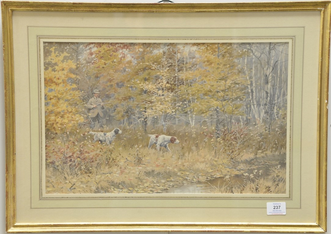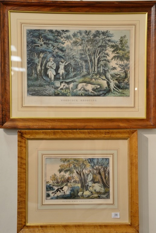 Nathaniel Currier, two hand colored lithographs, After F.F. Palmer 1852, Woodcock Shooting, by N. Currier, sight size 15 1/4 x 21 Water Rail Shooting, sight size 9 x 13 1/4 Provenance: Property from Credit Suisse’s Americana Collection