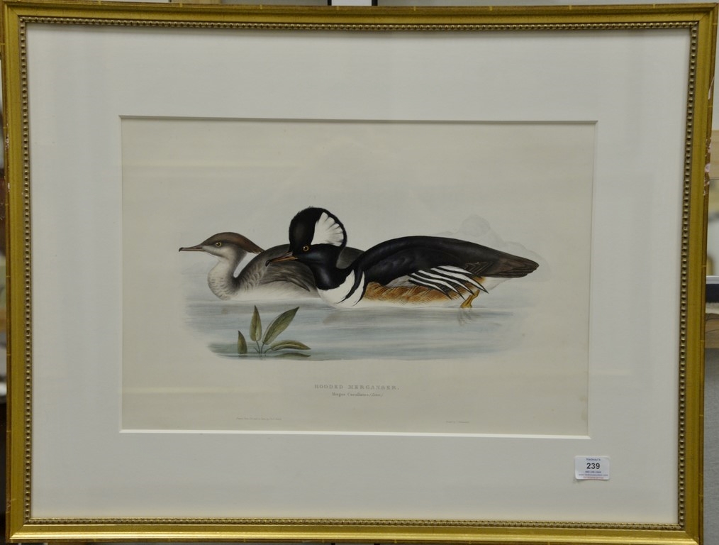 John Gould 1804-1881, pair of hand colored lithographs, printed by C. Hullmandel, Hooded Merganser 14 x 21 and Gadwall 14 x 21 Provenance: Property from Credit Suisse’s Americana Collection