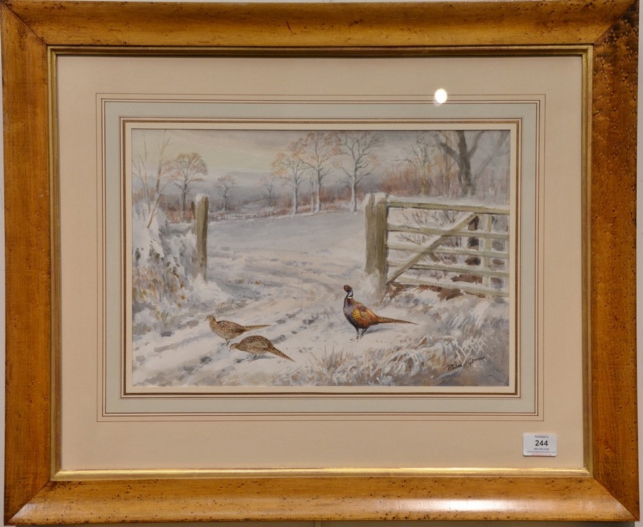 Roland Green 1896-1972 watercolor Pheasant & Hens in the Snow signed lower right: Roland Green sight size 11 3/4 x 17 Provenance: Property from Credit Suisse’s Americana Collection