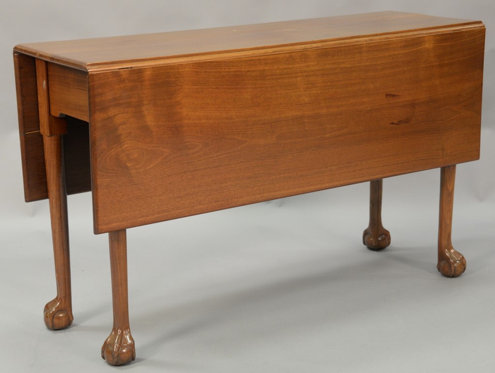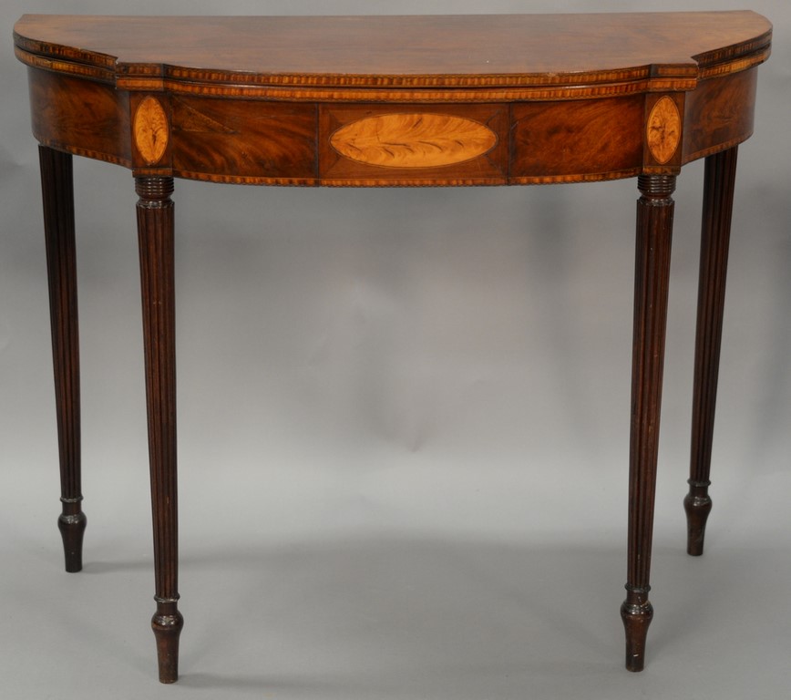 Sheraton mahogany games table having D shaped top over conforming frieze with maple panels, all set on turned and fluted legs, circa 1830. ht. 29in., wd. 36in.