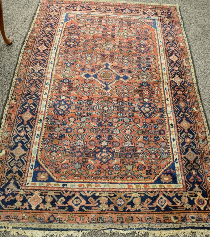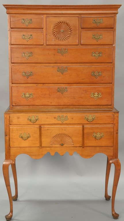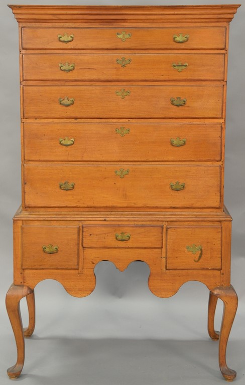 Queen Anne highboy in two parts, upper section with cornice molding over five drawers on lower portion with three short drawers with highly scalloped skirt on cabriole legs ending in pad feet, in old finish, circa 1750 replaced brasses. ht. 66in., case wd. 35 3/4in.