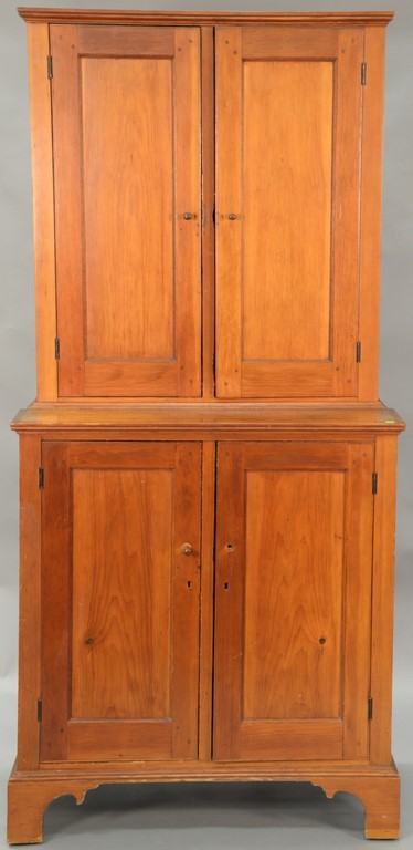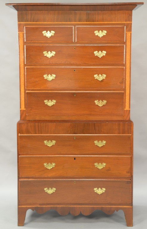 Mahogany chest on chest in two parts, upper section with large cornice molding over two short drawers over three long drawers flanked by birdseye maple inlaid panels set on lower section having three long drawers, all set on bracket base, circa 1780. ht. 79 3/4in., case wd. 40in., dp. 21in.
