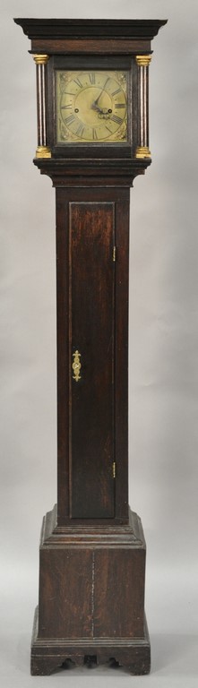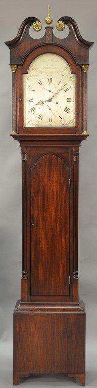 Mahogany tall case clock with pediment top mounted with brass tombstone metal dial having second hand and calendar hand, flanked by columns with brass capitals, dial marked Sim & Warden Aberdeen. ht. 86 1/2in.