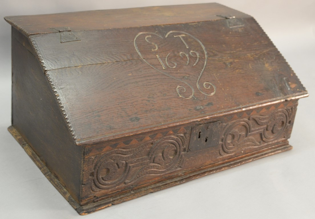 Oak bible box having slant hinged lid with chip carved edges over carved front with three drawer interior, lid carved with S.T. 1699 in a carved heart, late 17th century. ht. 13 1/2in., wd. 29in., dp. 18in.