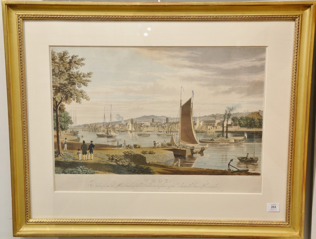 William James Bennett 1787-1844, hand colored aquatint etching, Troy Taken from the West Bank of the Hudson, In Front of the United States Arsenal, marked lower left: W.J. Bennett, marked lower right: Eng. by W.J. Bennett, marked bottom center: Published by Henry J. Megarey New York in 1838, sight size 17 3/4 x 25 1/2 Provenance: Property from Credit Suisse’s Americana Collection