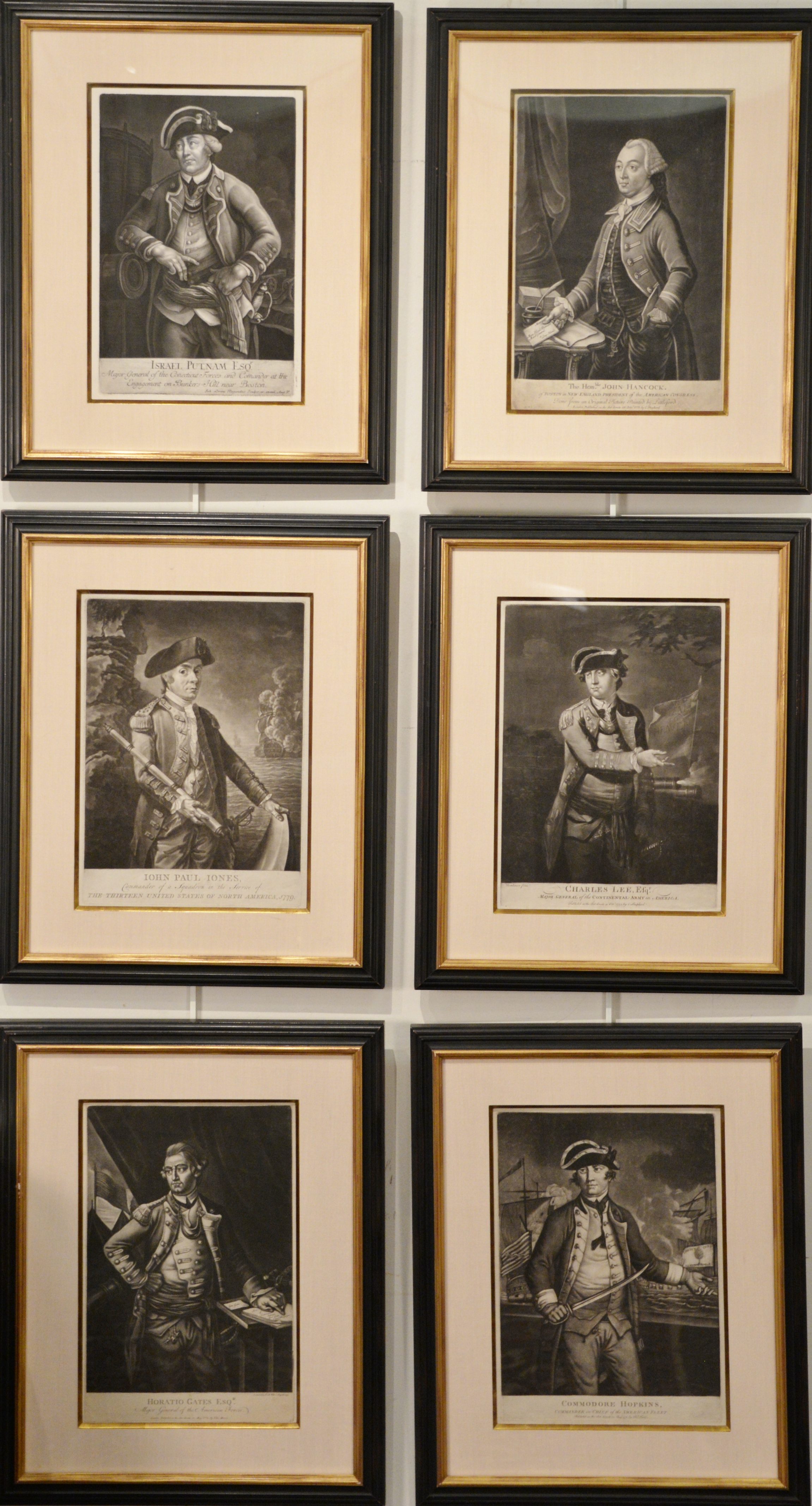 Set of six portrait mezzotint printed engravings After Thomlinson Charles Lee Esq. Major General of the Continental Army in America Horatio Gates Esq. Major General of the American Forces, published by John Morris Commodore Hopkins Commander in Chief of the American Fleet, published by Thomas Hart 1776 Israel Putnam Major General of the Connecticut Forces and Commander of the Engagement on Bunker Hill near Boston, published by John Lorenz Rugendas After Littleford, The Hon.ble John Hancock of Boston in New England, President of the American Congress, published by C. Shepherd 1775 John Paul Jones Iohn Paul Iones Commander of a Squadron in the Service of the Thirteen United States of North America 1779, sight sizeS 14 1/2 x 9 3/4 AND 14 1/4 X 10 1/2 Provenance: Property from Credit Suisse’s Americana Collection